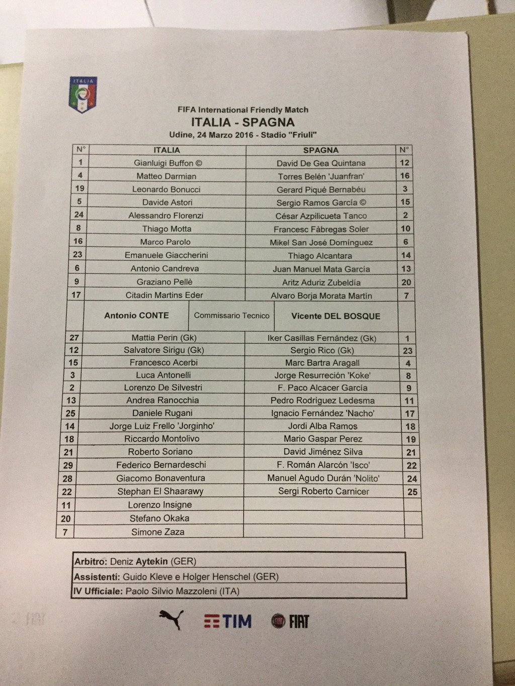 Italia: Gigi Buffon, Darmian, Bonucci, Astori, Alessandro Florenzi, Thiago Motta, Parolo, Giaccherini, Candreva, Pellè, Eder.