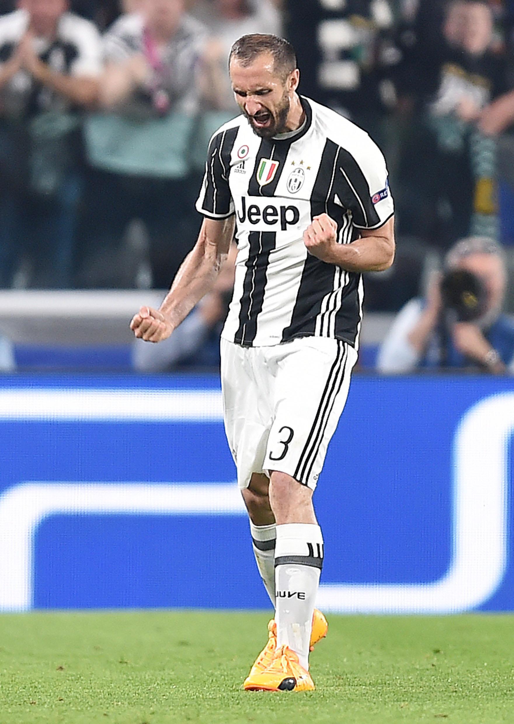 Juventus' Giorgio Chiellini (4L) jubilates with his teammates after scoring the goal during the UEFA Champions League quarter final first leg soccer match between Juventus FC and FC Barcelona at Juventus Stadium in Turin, Italy, 11 April 2017. ANSA/ALESSANDRO DI MARCO