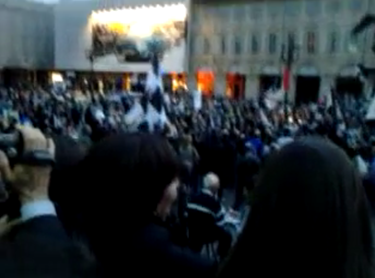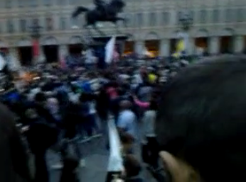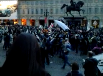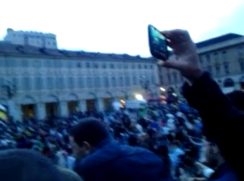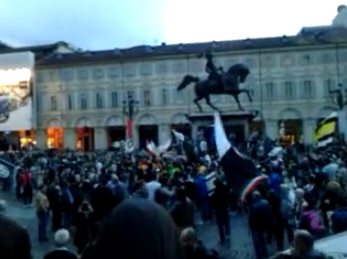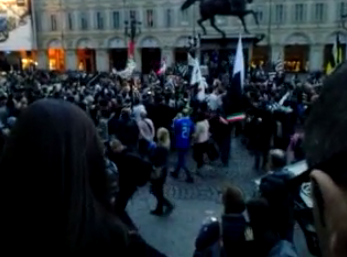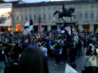 Attorno al ‘Caval d’Brons‘, il monumento equestre che è tra i simboli di Torino,  si sono  radunati centinaia di tifosi. Indossano maglie, sciarpe e cappelli con i colori della squadra del cuore: la Juventus. Molte le bandiere bianconere, che hanno sventolano mentre alcuni  altoparlanti hanno diffuso  ‘Juve storia di un grande amore‘, l’inno della squadra, scritto nel 2007 da Paolo Belli. Video BlitzQuotidiano.it.