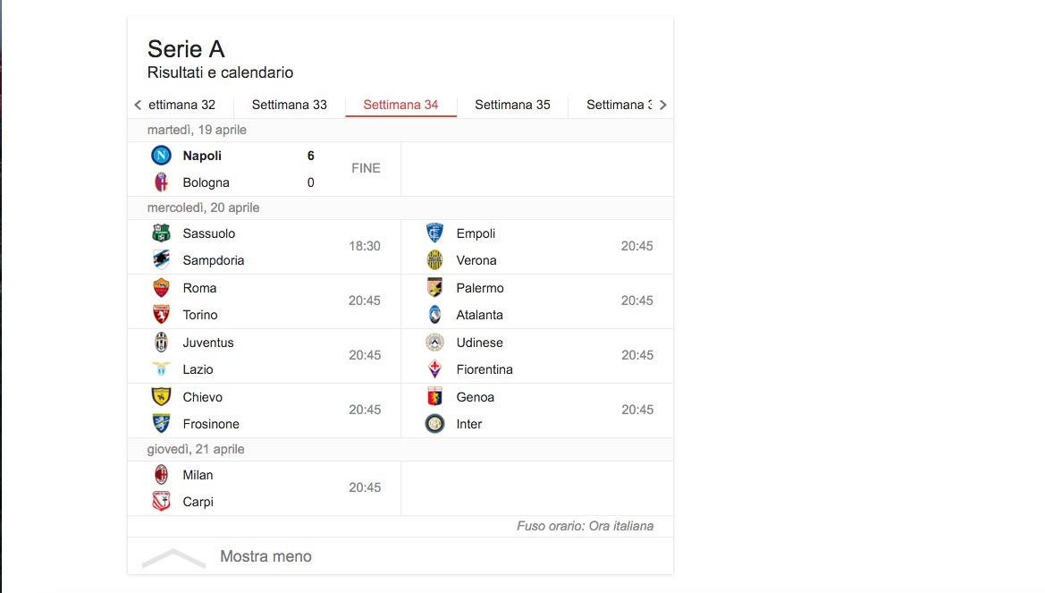 Classifica marcatori del campionato di calcio di Serie A dopo l’anticipo della 34/a giornata, Napoli-Bologna: – 30 reti: Higuain (3 rigori-Napoli). – 15 reti: Icardi (1-Inter); Bacca (Milan).