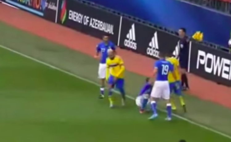 Milinkovic a terra dopo la pallonata presa in pieno volto (video: YouTube)