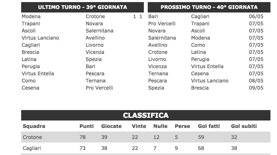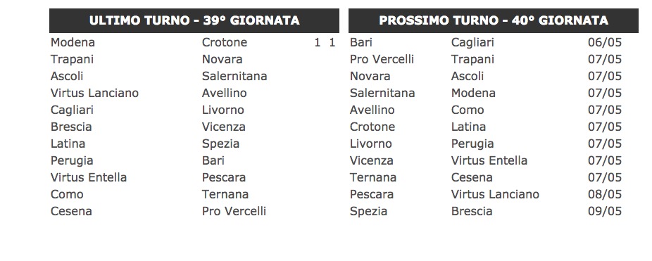 Caprari (Pescara; 1 rigore) Donnarumma (Salernitana) Nene’ (Spezia; 1 rigore) 10 reti Caracciolo And. (Brescia; 4 rigori) Ricci (Crotone; 1 rigore) Galabinov (Novara) Piccolo (Spezia/Vir. Lanciano; 4 rigori) Ceravolo (Ternana; 1 rigore) Falletti (Ternana) Raicevic (Vicenza) 9 reti Memushaj (Pescara; 5 rigori) Calaio’ (Spezia; 1 rigore)