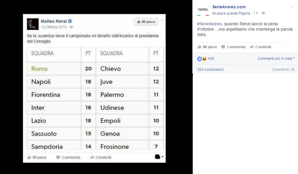 Il tweet in questione è datato 13 ottobre 2015 e contiene uno screenshot della classifica a quel punto del campionato. Si era nelle prime giornate, quelle da incubo per la Juve, che annaspava nella parte destra della classifica. E così l’autore della bufala web fa scrivere a Renzi: “Se la Juventus vince lo scudetto mi dimetto”.