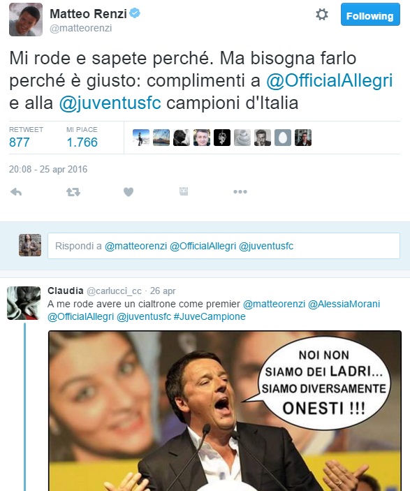 Sicuramente autentico è invece il tweet di congratulazioni che il premier ha digitato dopo la vittoria della Juventus. Cinguettio in cui il presidente del Consiglio ammette che “gli rode”: