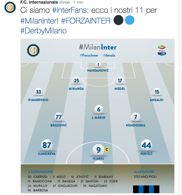 Arbitro: Tagliavento 6.5 Reti: nel pt 43′ Suso; nel st 8′ Candreva, 13′ Suso, 47′ Perisic Recupero: 1′ e 3′ Angoli: 8 a 1 per l’Inter Ammoniti: Kondogbia, Kucka, De Sciglio, Ansaldi, Jovetic per gioco falloso, Perisic per comportamento non regolamentare Spettatori: 77.882.
