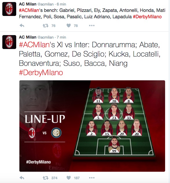 – 13′ st: Suso duetta con Bacca al limite, lascia sul posto prima Murillo e poi Miranda e con un rasoterra preciso di destro trafigge Handanovic – 47′ st: torre di Murillo da calcio d’angolo e inserimento di Perisic che batte Donnarumma da due passi di piatto sinistro.