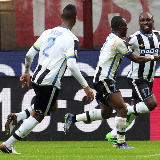 Udinese (3-5-2): Karnezis 7, Felipe 6, Danilo 6, Wague 6, Edenilson 6, Badu 6, Lodi 6 (19′ st Guilherme 6), Kuzmanovic 6, Armero 6.5 (29′ st Widmer 5.5), Therau 5.5, Matos 6 (21′ st Zapata 5.5) (97 Meret, 8 Bruno Fernandes, 10 Di Natale, 18 Perica, 53 Ali Adnan, 55 Hallfredsson, 75 Hertaux, 89 Piris). All.: Colantuono 6 Arbitro: Irrati di Pistoia 6 Reti: nel pt 17′ Armero, nel st 3′ Niang Recupero 1′ e 4′ Angoli: 9 a 0 per il Milan Ammoniti: Badu, Montolivo, Lodi, Edenilson per gioco falloso Spettatori: 27.656 incasso di 663.815.