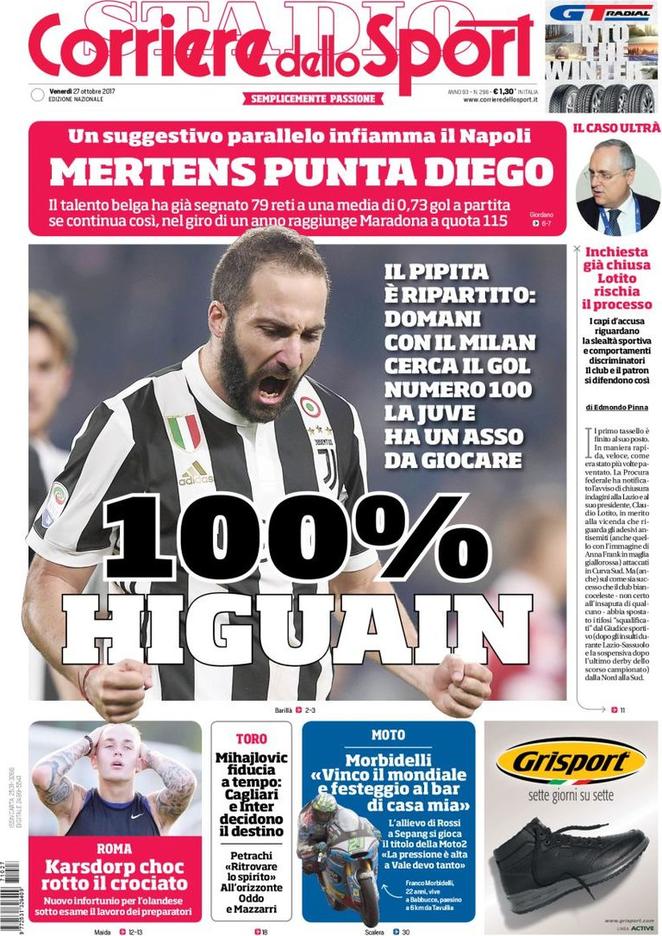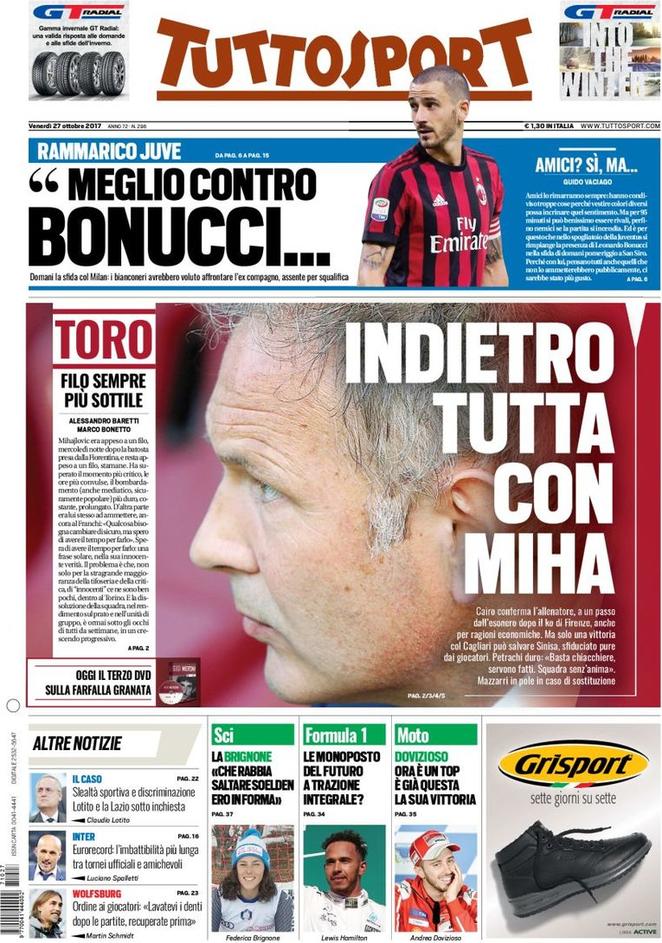 Tutte le principali news sullo sport, dal basket ai motori, sui giornali italiani di oggi, venerdì 27 ottobre.