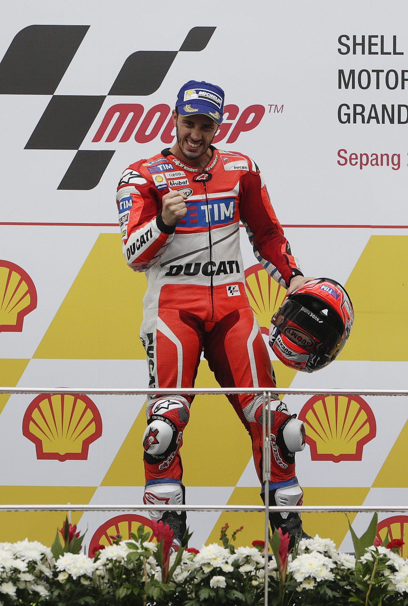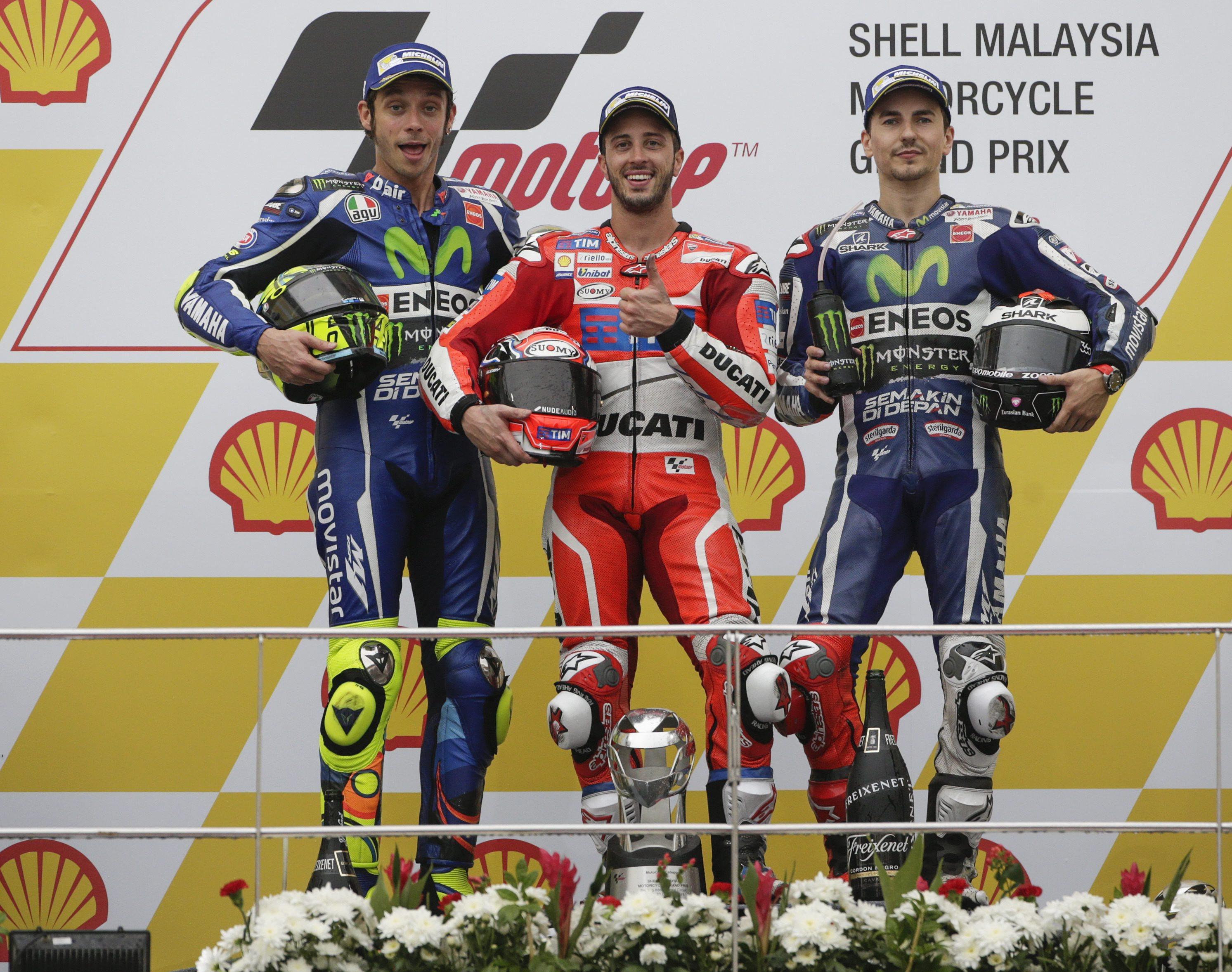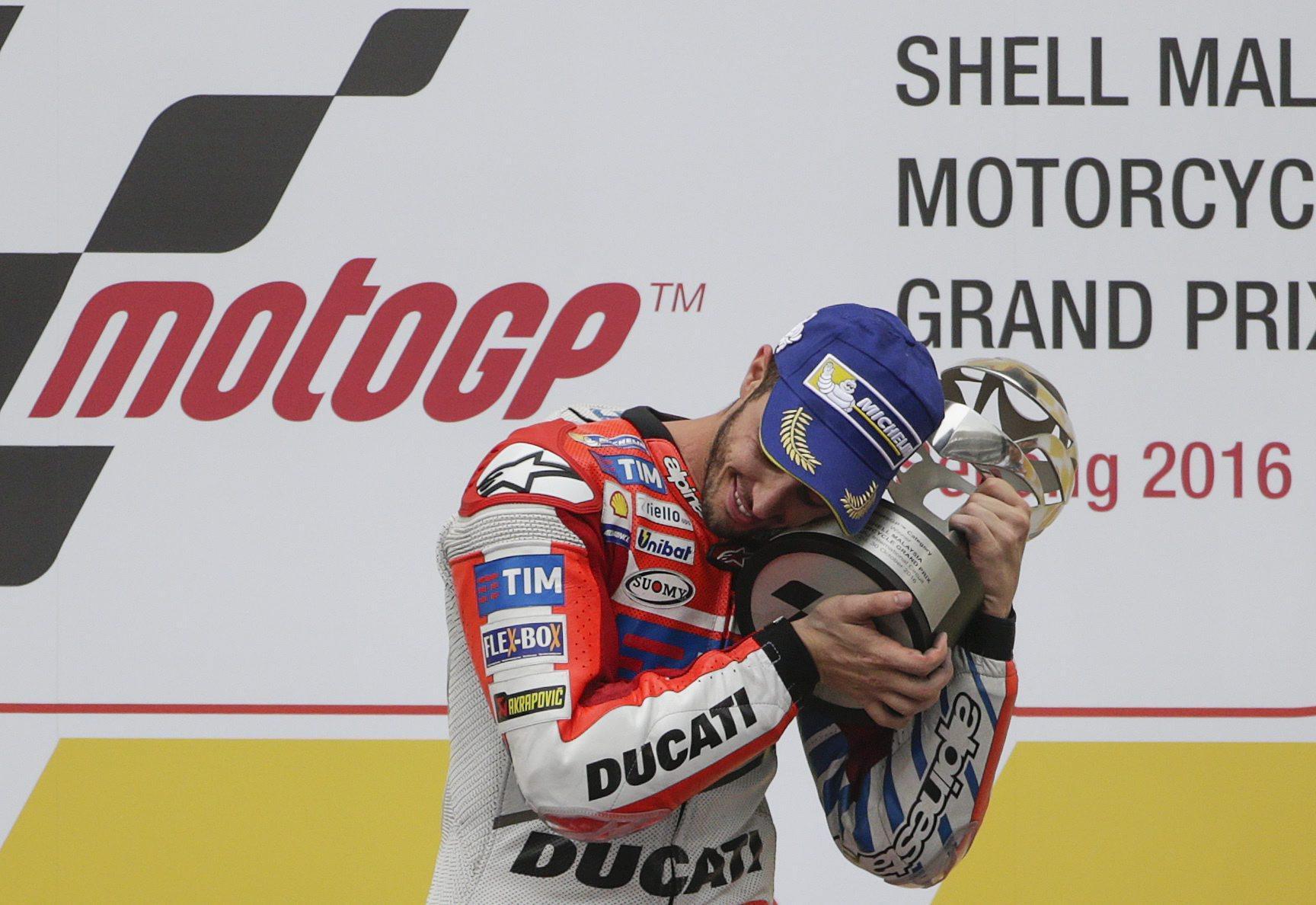 SEPANG – Motogp: doppietta italiana nel Gp della Malesia. Andrea Dovizioso, in sella alla Ducati, ha vinto la gara, penultima prova del mondiale MotoGp 2016, precedendo Valentino Rossi (Yamaha). Terzo posto per lo spagnolo Jorge Lorenzo, anche lui su Yamaha.