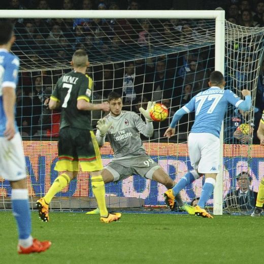 Milan: (4-4-2): Donnarumma 5.5, Abate 5.5, Alex 6.5, Zapata 6.5, Antonelli 5.5, Honda 6, Kucka 6.5, Montolivo 6 (37′ st Bertolacci sv), Bonaventura 6.5, Bacca 4.5 (26′ Menez sv), Niang 5 (41′ st Balotelli sv). (32 Abbiati, 97 Livieri, 2 De Sciglio, 13 Romagnoli, 25 Simic, 96 Calabria, 16 Poli, 4 Mauri, 72 Boateng). All.: Mihajlovic 6. Arbitro: Banti di Livorno 5. Reti: nel pt 38′ Insigne, 43′ Bonaventura. Angoli: 6-3 per il Napoli. Recupero: 1′ e 4′. Espulsi: Sarri (28′ st) per proteste. Ammoniti: Donnarumma per comportamento non regolamentare. Spettatori: 55 mila.