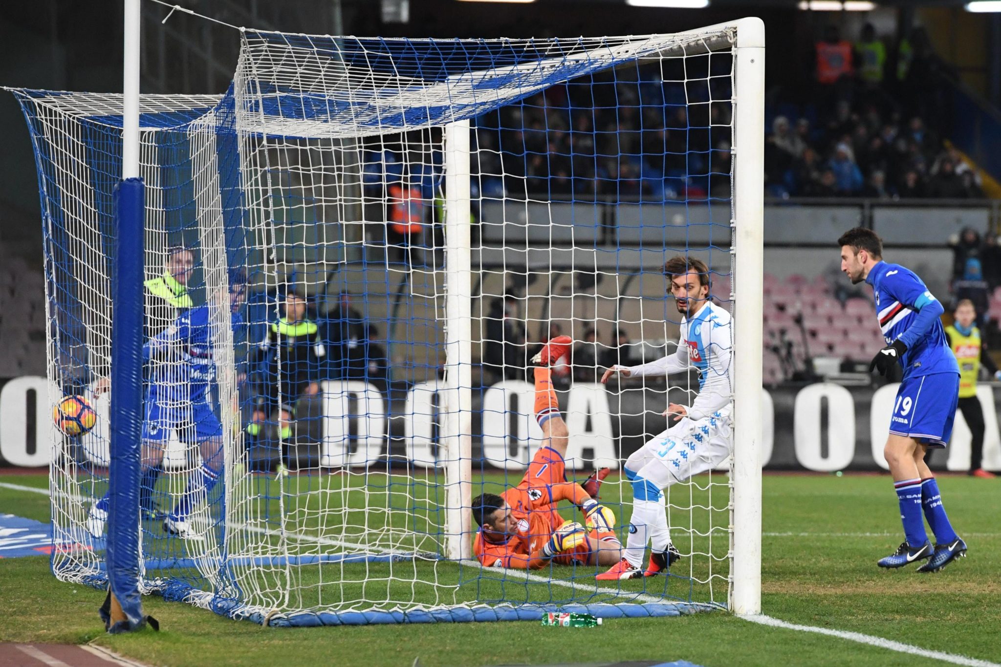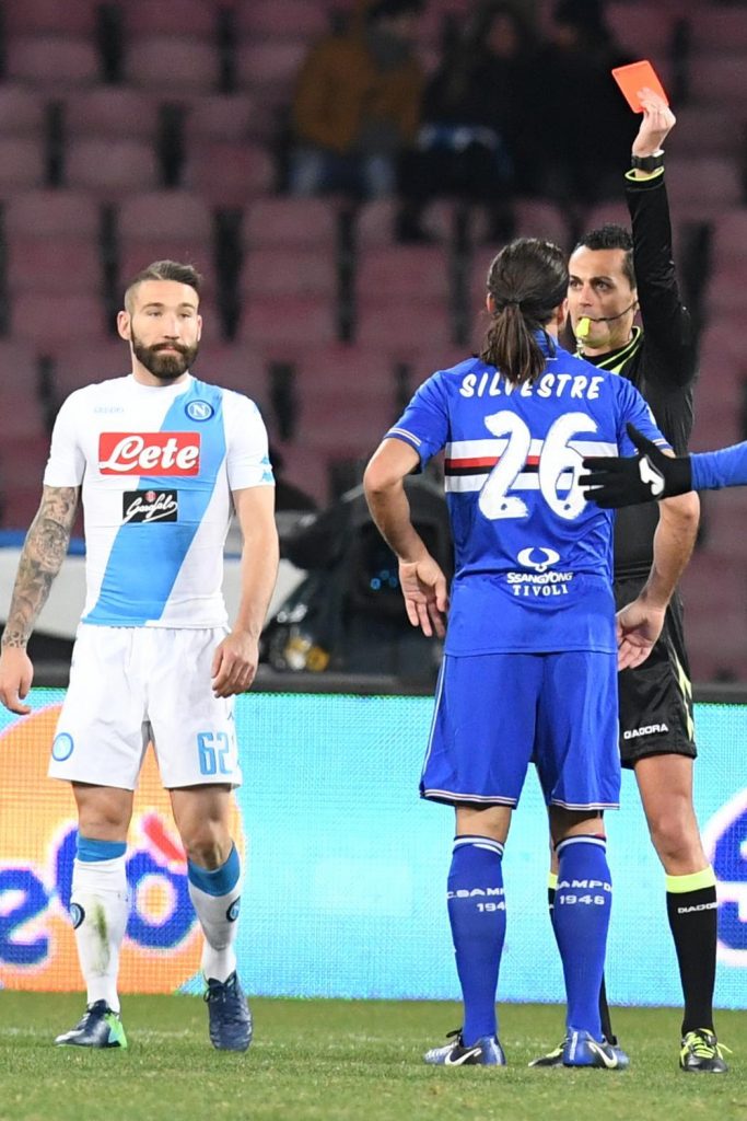 Nel secondo tempo il Napoli è più aggressivo, ma i liguri sono sempre molto abili ad arginare le fonti del gioco degli azzurri e non corrono grandi pericoli. Al 15′, però, arriva l’ingenuita di Silvestre che era appena stato ammonito per un fallo di gioco e che, su un’azione offensiva della Sampdoria, fermata da Reina, rincorre il portiere che si appresta al rilancio e forse lo tocca.