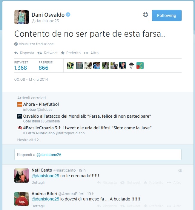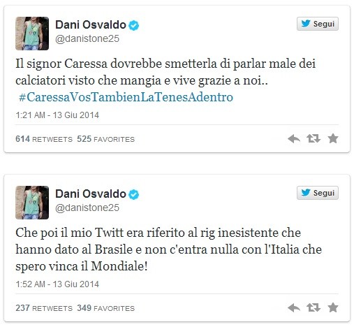 “Che poi il mio Twitt era riferito al rig inesistente che hanno dato al Brasile non c’entra nulla con l’Italia che spero vinca il Mondiale!”