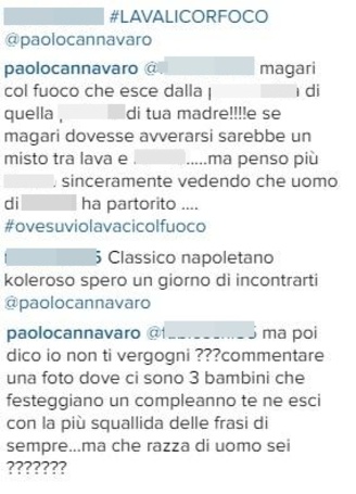 Poi arriva un commento offensivo di un utente (“Lavali cor foco”) scatena l’ira di Cannavaro che decide di rispondere in maniera incontrollata. Il riferimento ai figli non va giù al difensore che risponde furibondo: “Magari col fuoco che esce dalla xxx di quella xxx di tua madre. E se magari dovesse avverarsi un misto di lava e xxx… ma penso più xxx sinceramente vedendo che uomo di xxx ha partorito… #ovesuviolavacicolfuoco. Ma poi dico io non ti vergogni? Commentare una foto dove ci sono 3 bambini che festeggiano un compleanno te ne esci con la più squallida delle frasi di sempre…ma che razza di uomo sei?”.