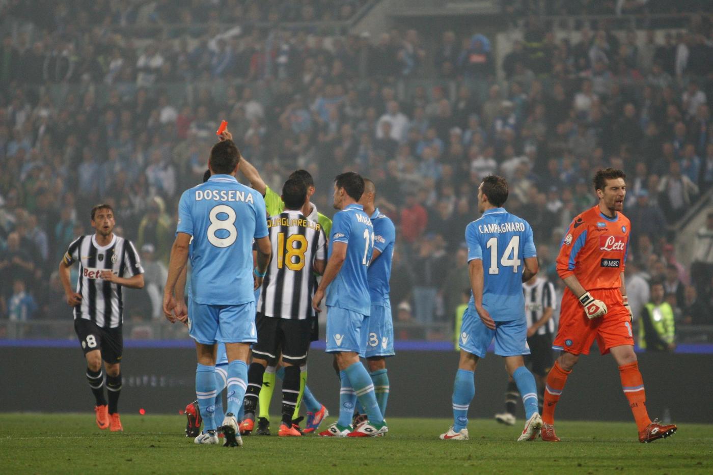 Jonathan Moscrop – LaPresse20 05 2012 Roma ( Italia )Sport CalcioJuventus vs. Napoli – Finale Coppa Italia TIM Cup 2011 2012 – Stadio Olimpico di RomaNella foto: L’arbitro Christian Brighi espelle Fabio Quagliarella dopo uno scontro con Salvatore Aronica