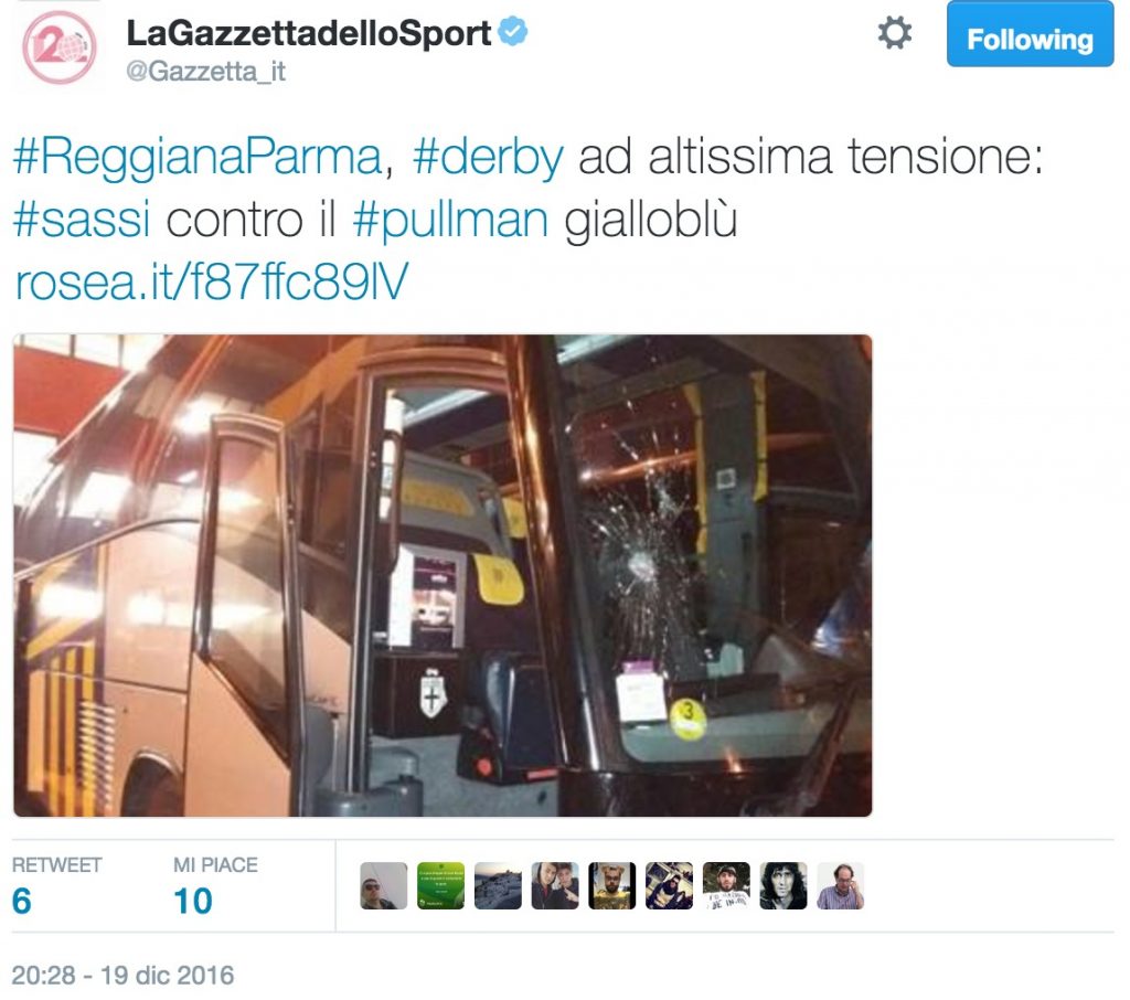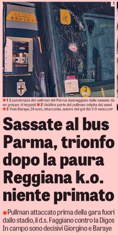 Sassi sul pullman del Parma un’ora e mezzo prima dell’inizio del “derby del Parmigiano Reggiano” (o “derby dell’Enza”) fra Reggiana e Parma, gara attesa da 20 anni. Il bus della squadra parmigiana stava arrivando al “Mapei Stadium” scortato da tre auto della polizia, quando è stato accerchiato e aggredito da un gruppo di ultras reggiani. Sul pullman sono state lanciate pietre e bengala. Gli ultrà granata sono riusciti a danneggiare il parabrezza dell’autobus prima che la polizia riuscisse a disperderli.