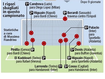 Tutto merito delle statistiche, dei computer, dello studio dei portieri e, soprattutto, tutta colpa degli attaccanti che forse non sanno più tirare. Handanovic a parte (24 rigori parati su 54) in Italia si sono messi in evidenza altri due giovani (classe ’92 ) portieri: Bardi del Chievo e Sportiello dell’Atalanta. Entrambi hanno già parato due rigori.