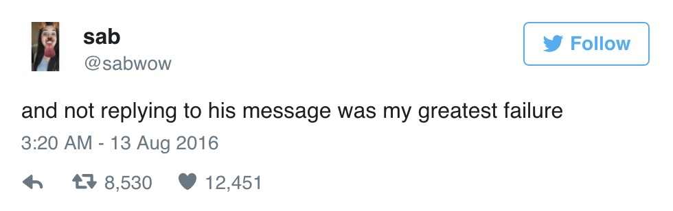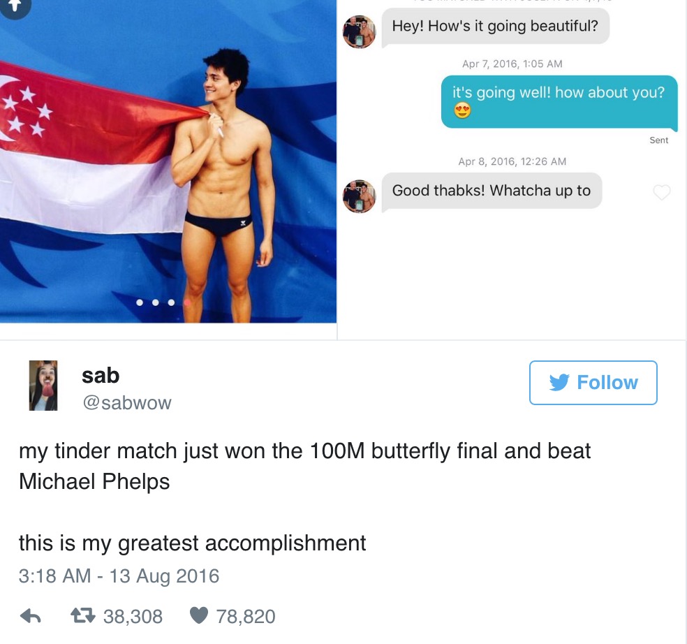 Sabryna Salazar su Twitter ha reso pubblico il suo rammarico di aver rifiutato Joseph. “Il mio contatto di Tinder ha appena vinto la medaglia d’oro nella finale dei 100 mt a farfalla battendo Phelps. È il mio traguardo più grande”, ha scritto, per aggiungere poco dopo: “E non rispondergli è stato il mio più grande fallimento”.