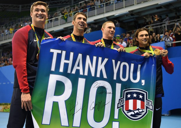Michael Phelps ha ottenuto il tempo di 50″33 a delfino. La sua è stata un’uscita di scena trionfale dato che ha chiuso come aveva cominciato ad Atene con 6 medaglie. Ad aiutarlo sono stati il dorsista Ryan Murphy in 51″85, che polverizza il record mondiale dei 100 dorso (l’ottavo di questi Giochi) cancellando il mitico 51″94 di Aaron Peirsol del 2009 a Indianapolis; il ranista Cody Miller in 59″03 e lo stileliberista Nathan Adrian in 46″74.