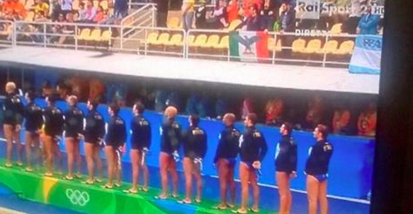 RIO DE JANEIRO – Rio 2016, Rai in imbarazzo: spunta bandiera fascista in diretta tv FOTO. Una bandiera tricolore italiana con al centro un’enorme aquila che sovrasta un fascio littorio è apparsa durante l’inno di Mameli alle Olimpiadi di Rio. Come scrive liberoquotidiano.it, l’imbarazzante presenza sugli spalti è stata immortalata dalle telecamere della Rai poco prima della partita di pallanuoto maschile tra il Settebello italiano e l’ostica Croazia, che ha battuto gli azzurri 10-7. Quella strana bandiera, chiaro riferimento a quella della Repubblica di Salò, è stata vista da tutto il mondo, con la regia internazionale e quella della Rai che ha anche regalato un primo piano al cimelio nostalgico.