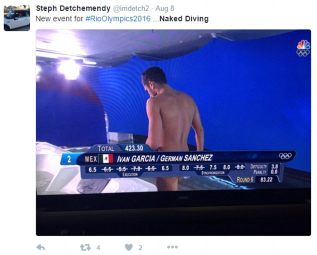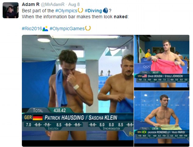 RIO DE JANEIRO – Gli atleti specializzati nei tuffi, a Rio 2016 sono rimasti vittime di un’illusione ottica molto particolare. Sugli schermi televisivi, dopo le gare sono apparsi come se non indossassero il costume. A coprire le parti intime una scritta in sovraimpressione con su scritti i tempi. Ovviamente è solo unillusione ottica dovuta alla posizione della scritta sulla schermo però ciò non è bastato a non scatenare, su Twitter, diversi commenti divertiti.