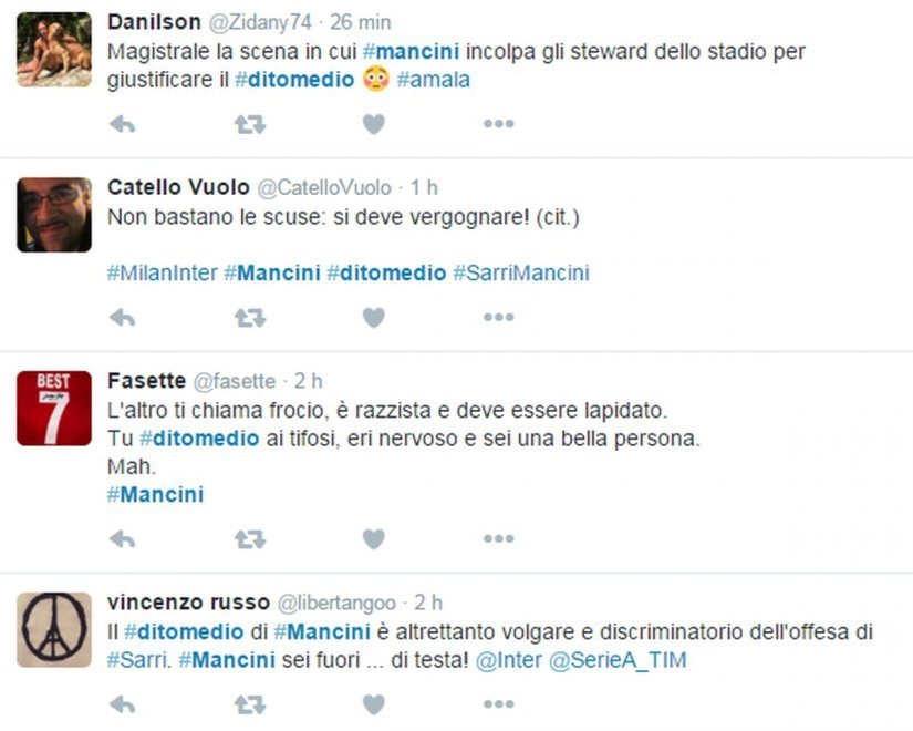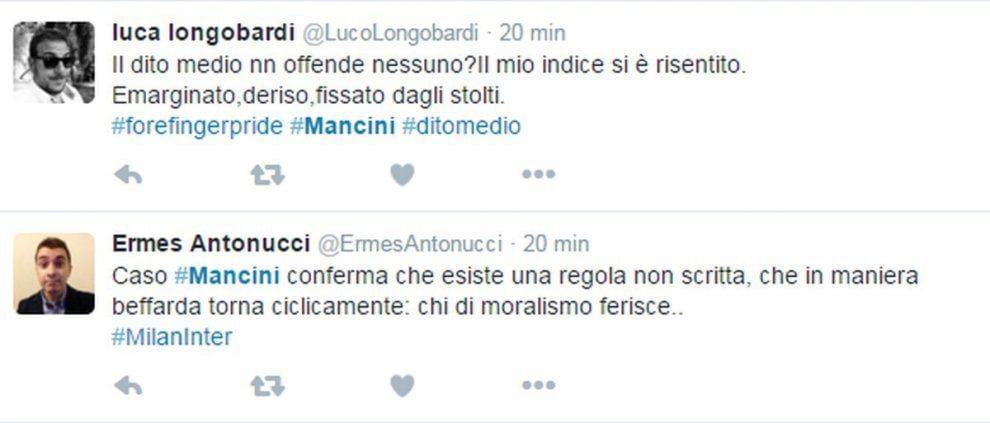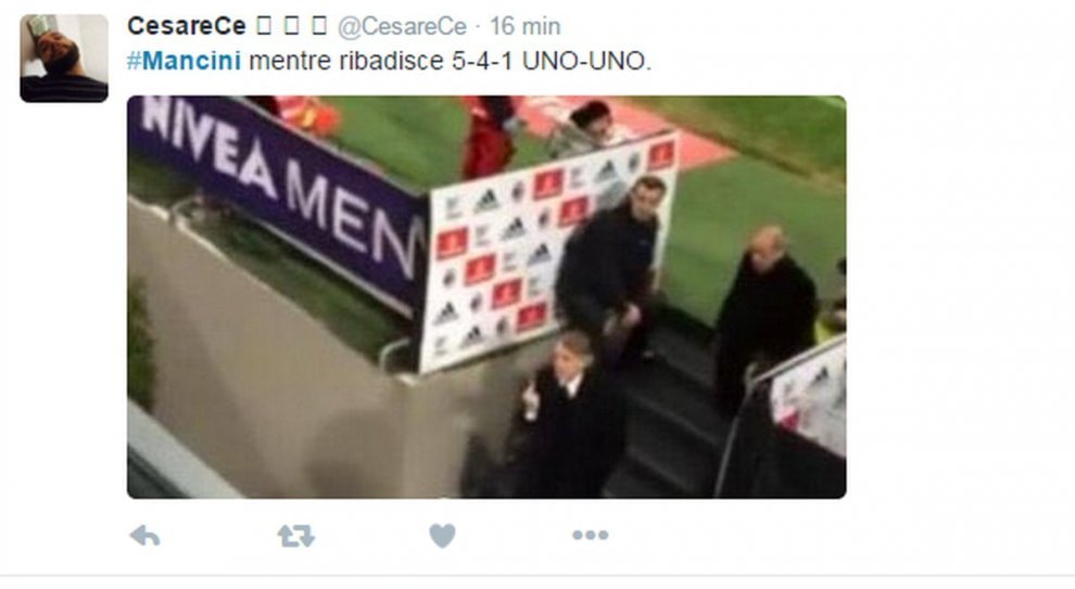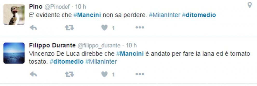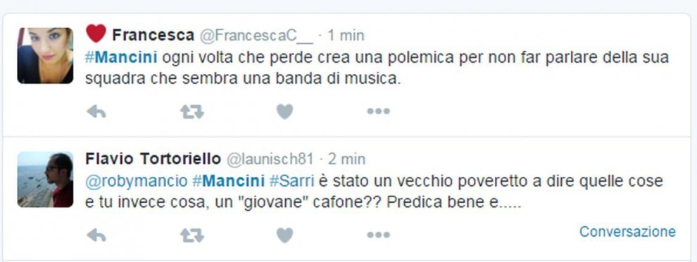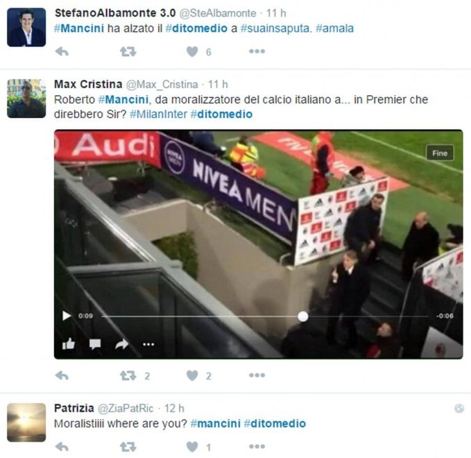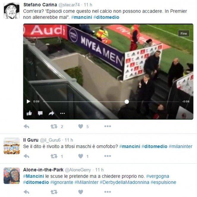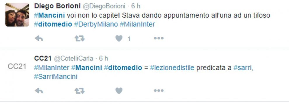 La foto è subito girata su Twitter, scatenando le polemiche dei tifosi che accusano Mancini di incoerenza dopo le polemiche con Sarri in Coppa Italia. Ma dopo la partita Mancini ha anche rivolto diverse parolacce alla giornalista Mikaela Calcagno nel corso dell’intervista di rito ai microfoni di Mediaset Premium. L’allenatore dell’Inter ha iniziato a perdere la calma dopo che la giornalista gli aveva chiesto se dietro all’errore dagli undici metri di Icardi potesse esserci la sua battuta della settimana scorsa “certi gol li farei anche io a 50 anni…”.
