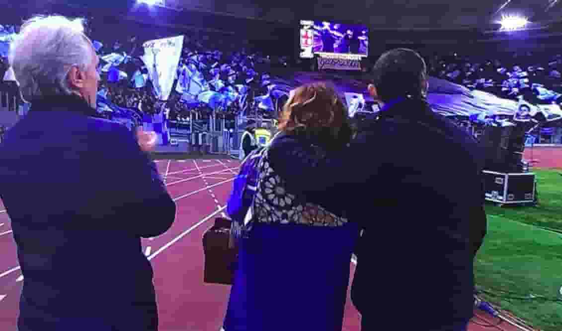 Nel decimo anniversario della morte di Gabriele Sandri, i genitori di “Gabbo” e il fratello hanno sfilato sulla pista di atletica dello Stadio Olimpico e hanno ricevuto gli applausi di tutti i tifosi presenti.