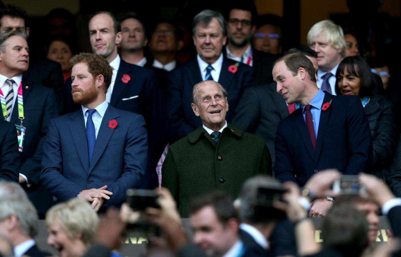 (left to right) Prince Harry, Duke of Edinburgh and the Duke of Cambridge during the Rugby World Cup Final at Twickenham, London. PRESS ASSOCIATION Photo. Picture date: Saturday October 31, 2015. See PA story RUGBYU Final. Photo credit should read: David Davies/PA Wire. RESTRICTIONS: Editorial use only. Strictly no commercial use or association without RWCL permission. Still image use only. Use implies acceptance of Section 6 of RWC 2015 T&Cs at: http://bit.ly/1MPElTL Call +44 (0)1158 447447 for further info.