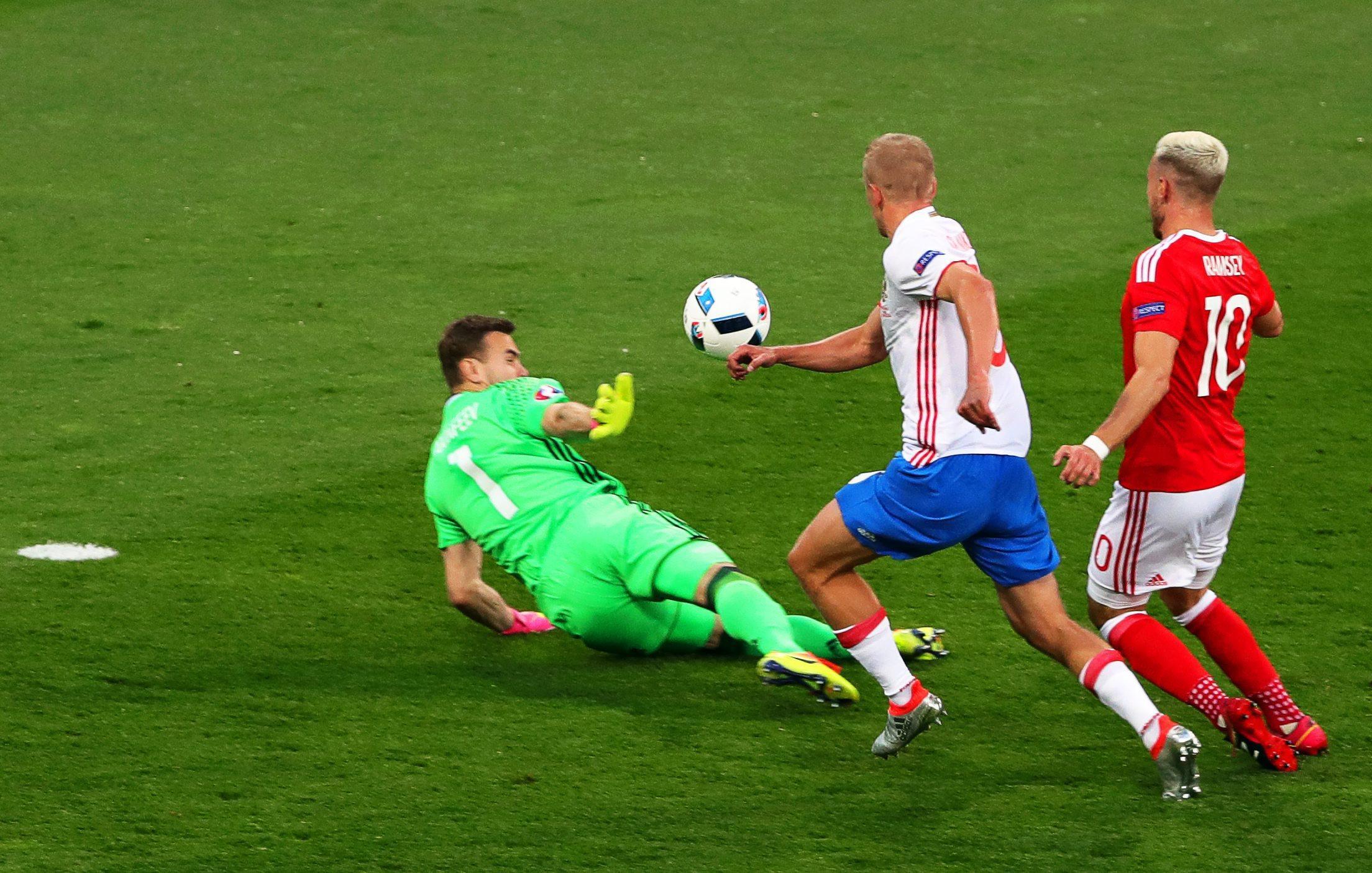 VIDEO – Galles in vantaggio con Ramsey. Il calciatore dell’Arsenal ha eluso la trappola del fuorigioco e ha battuto Akinfeev con un bel tocco sotto.