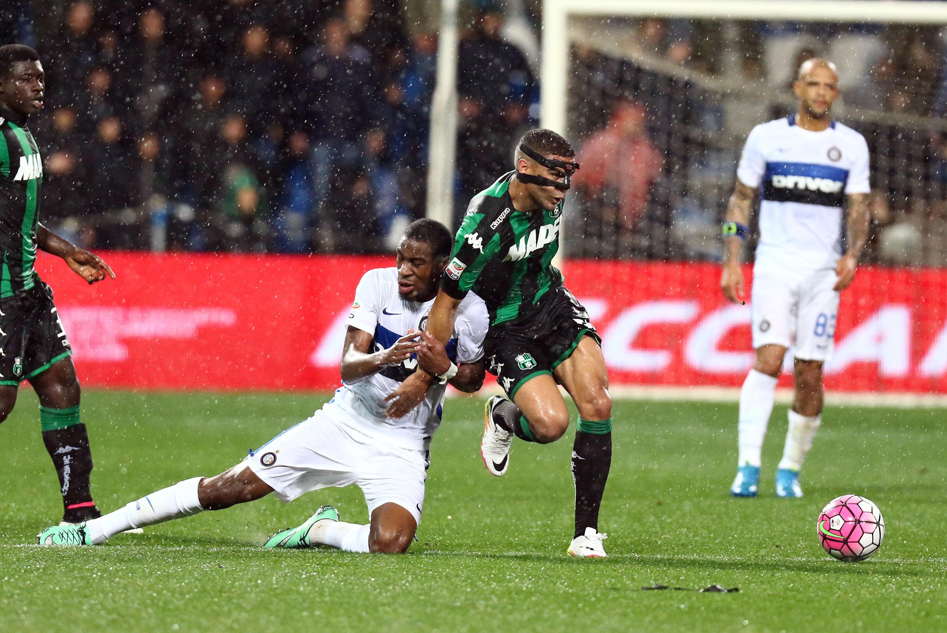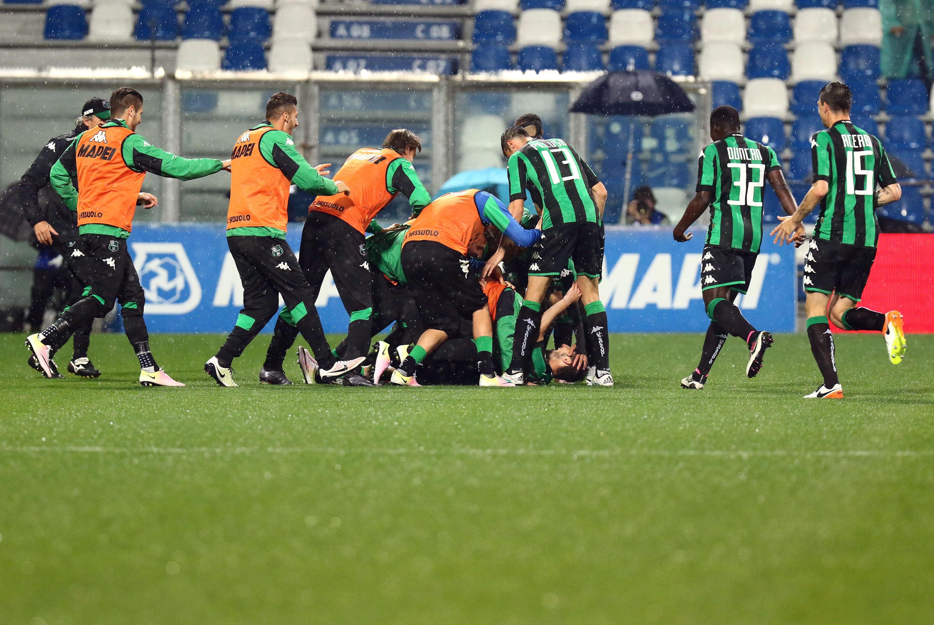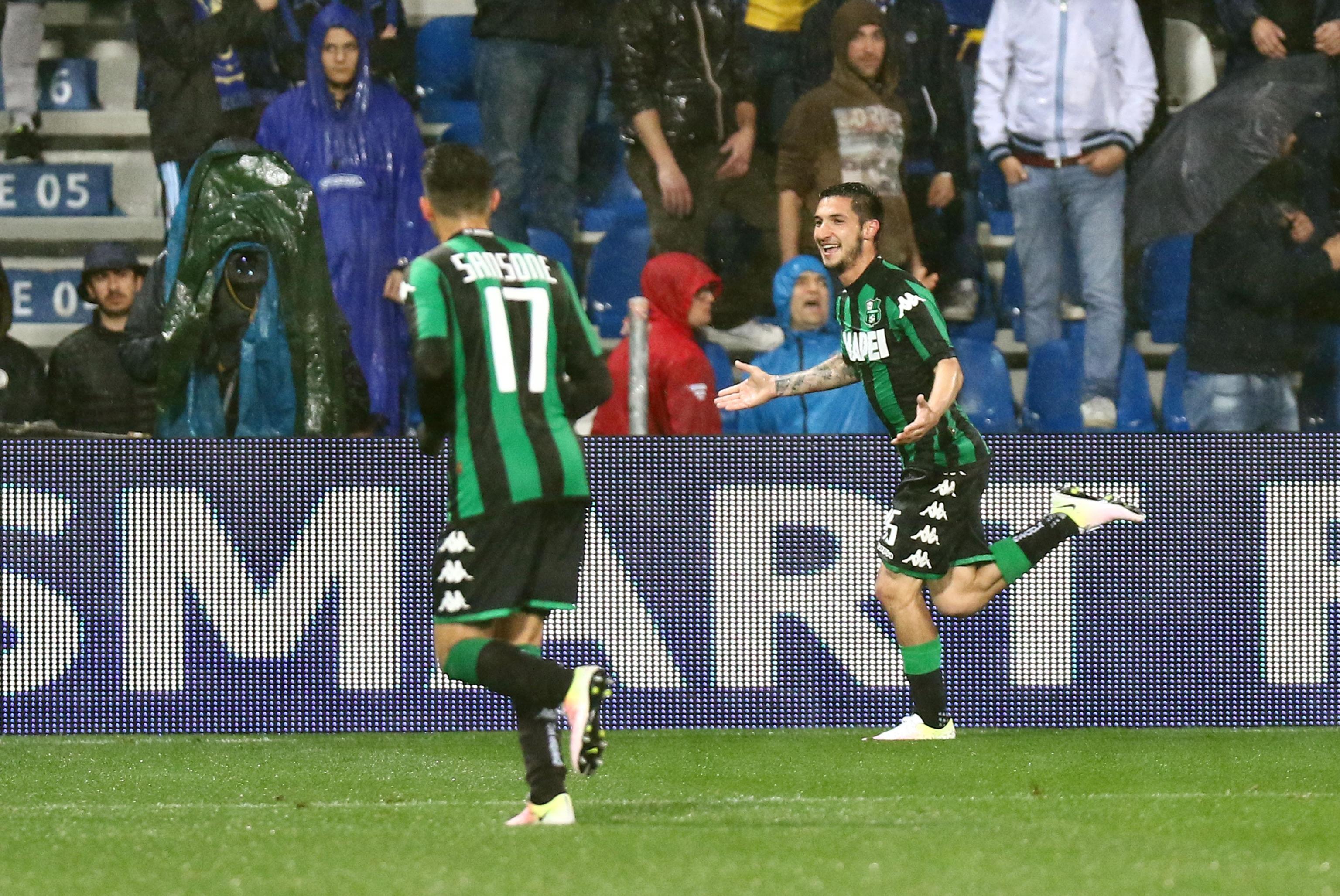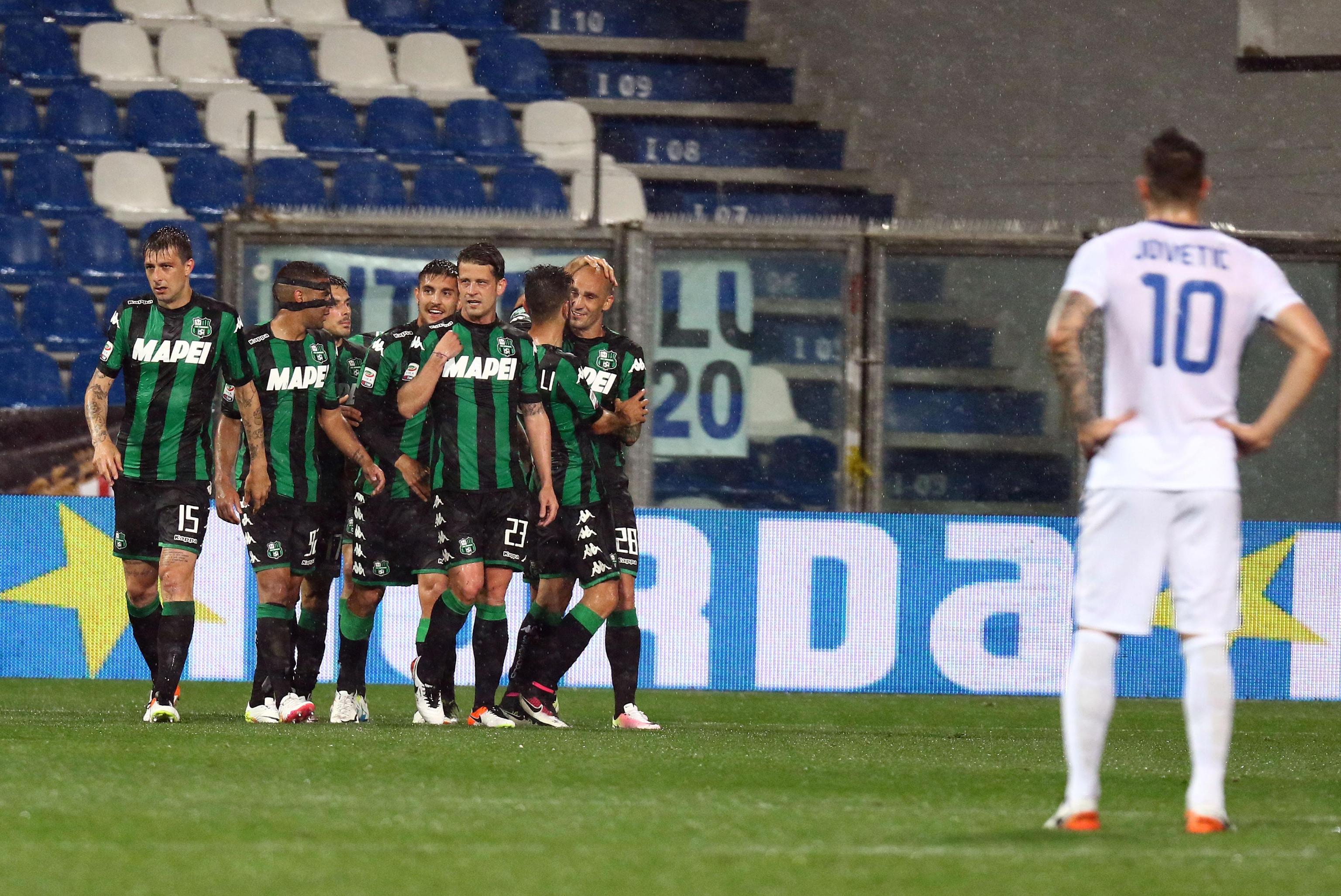 – 31′ pt: Magnanelli sbaglia un disimpegno sul limite della propria area, Brozovic gli ruba palla e Palacio la mette dentro – 39′ pt: terza rete del Sassuolo, con Gazzola che dalla destra serve a centroarea Politano che di testa sorprende l’immobile difesa nerazzurra. Foto Ansa.