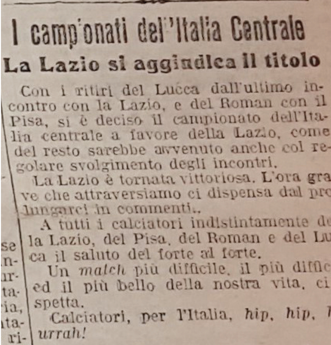 Quindi, se è probabile che i biancocelesti avrebbero battuto una delle due squadre napoletane nella finale centro-meridionale, è ancora più probabile che avrebbero perso una eventuale finale col Genoa, come sostengono i “filo-genoani” sul Secolo XIX: il livello delle società calcistiche settentrionali era molto più alto di quelle del resto d’Italia, tanto che bisognerà aspettare il 1942 (As Roma) per vedere vincere lo scudetto a una squadra centro-meridionale.