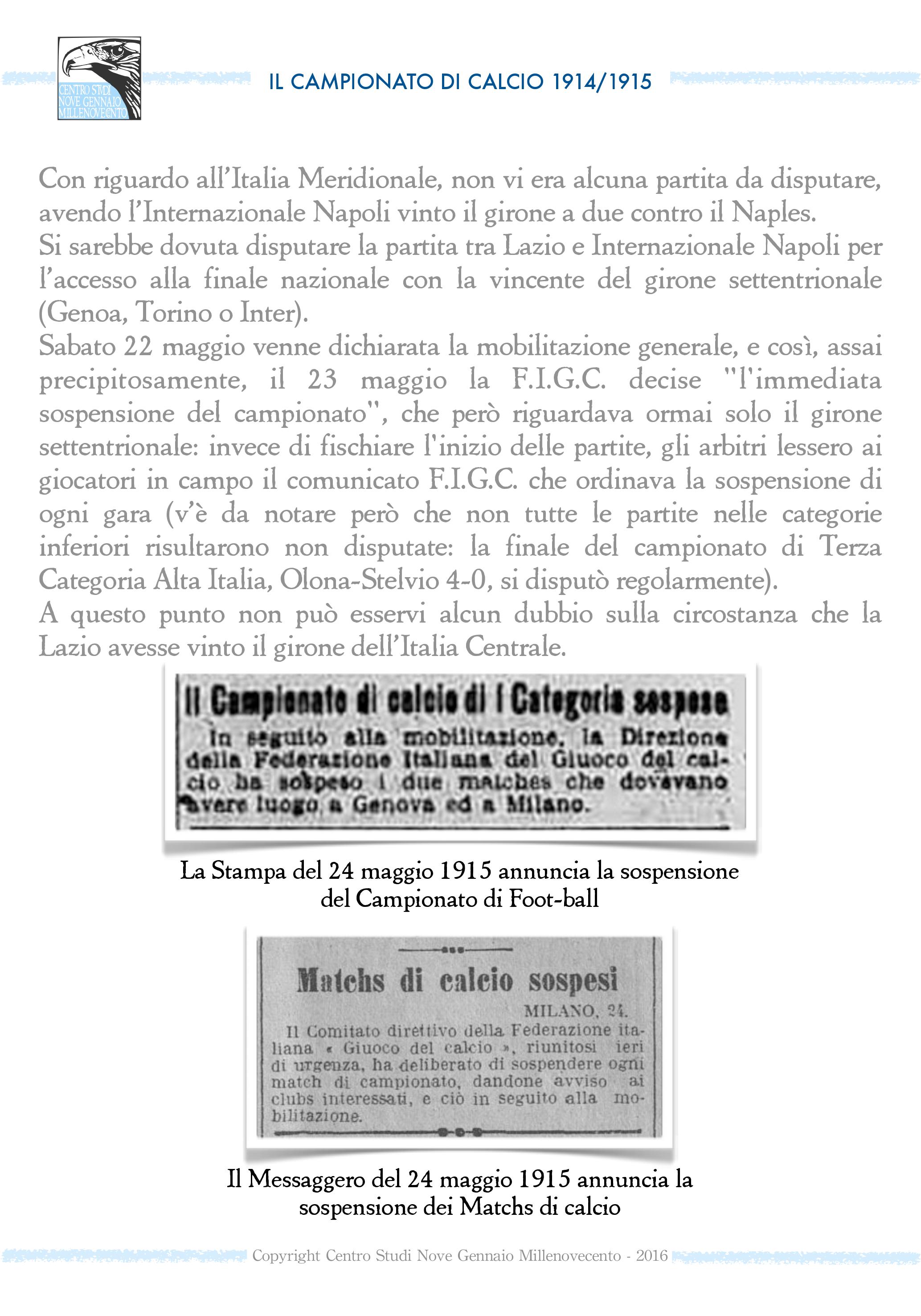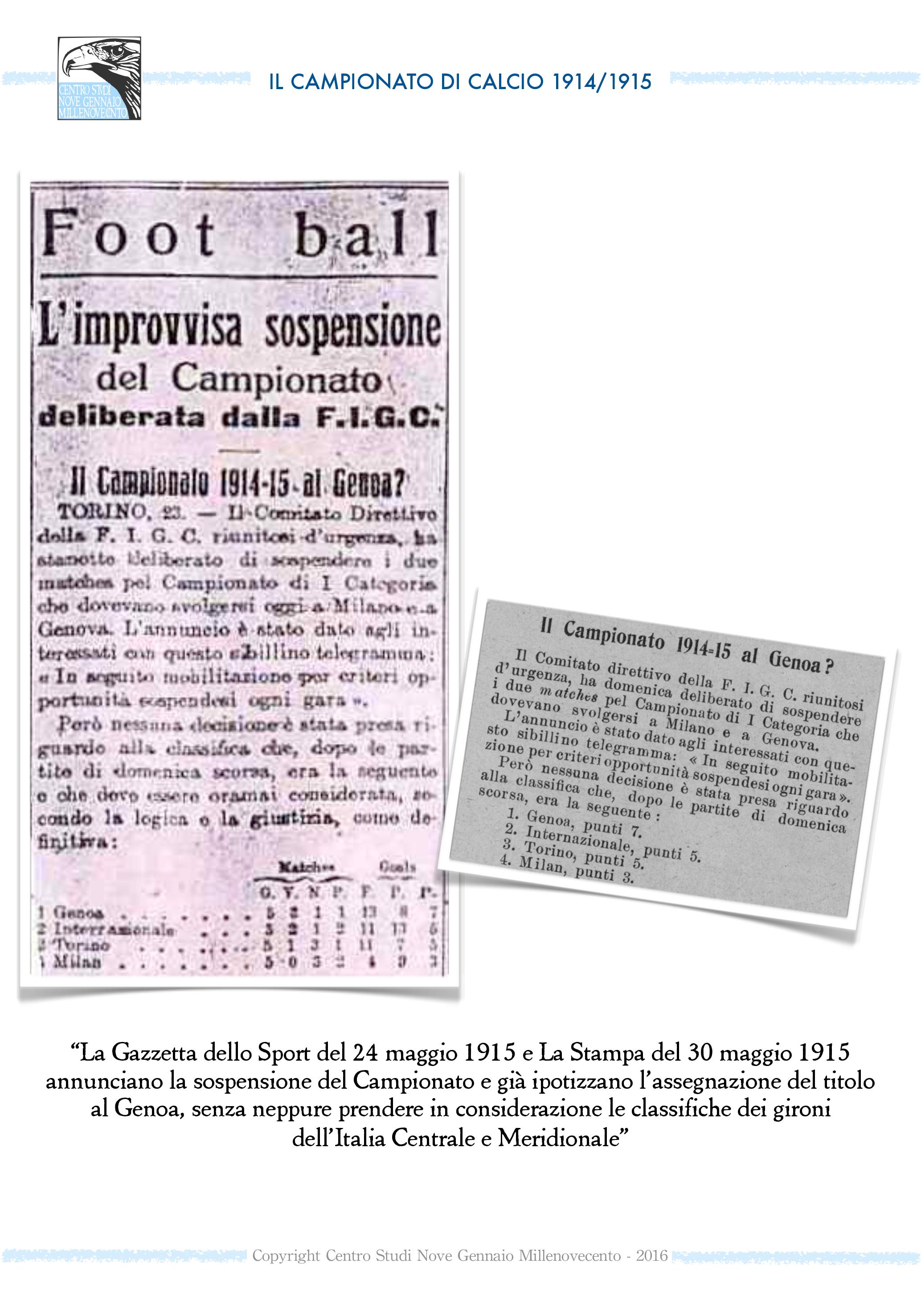 Perché due squadre? Il Genoa era il primo del girone Nord, la Lazio era prima nel girone Centro-Sud. Avrebbero dovuto affrontarsi in una finale che non è mai stata giocata, essendo l’Italia entrata in guerra al fianco di Francia, Gran Bretagna e Russia il 24 maggio 1915, quando il girone Nord doveva giocare ancora l’ultima partita di ritorno.