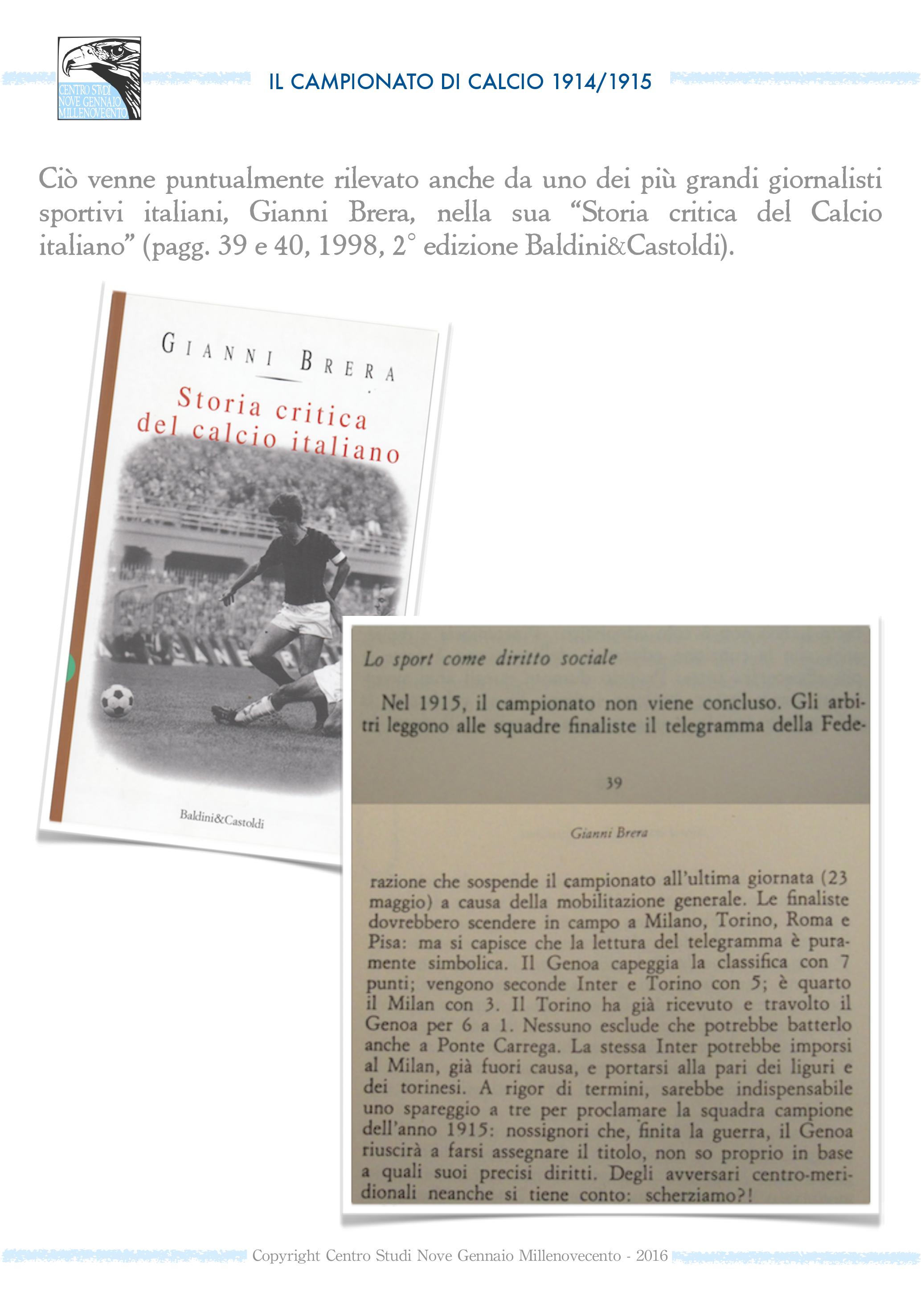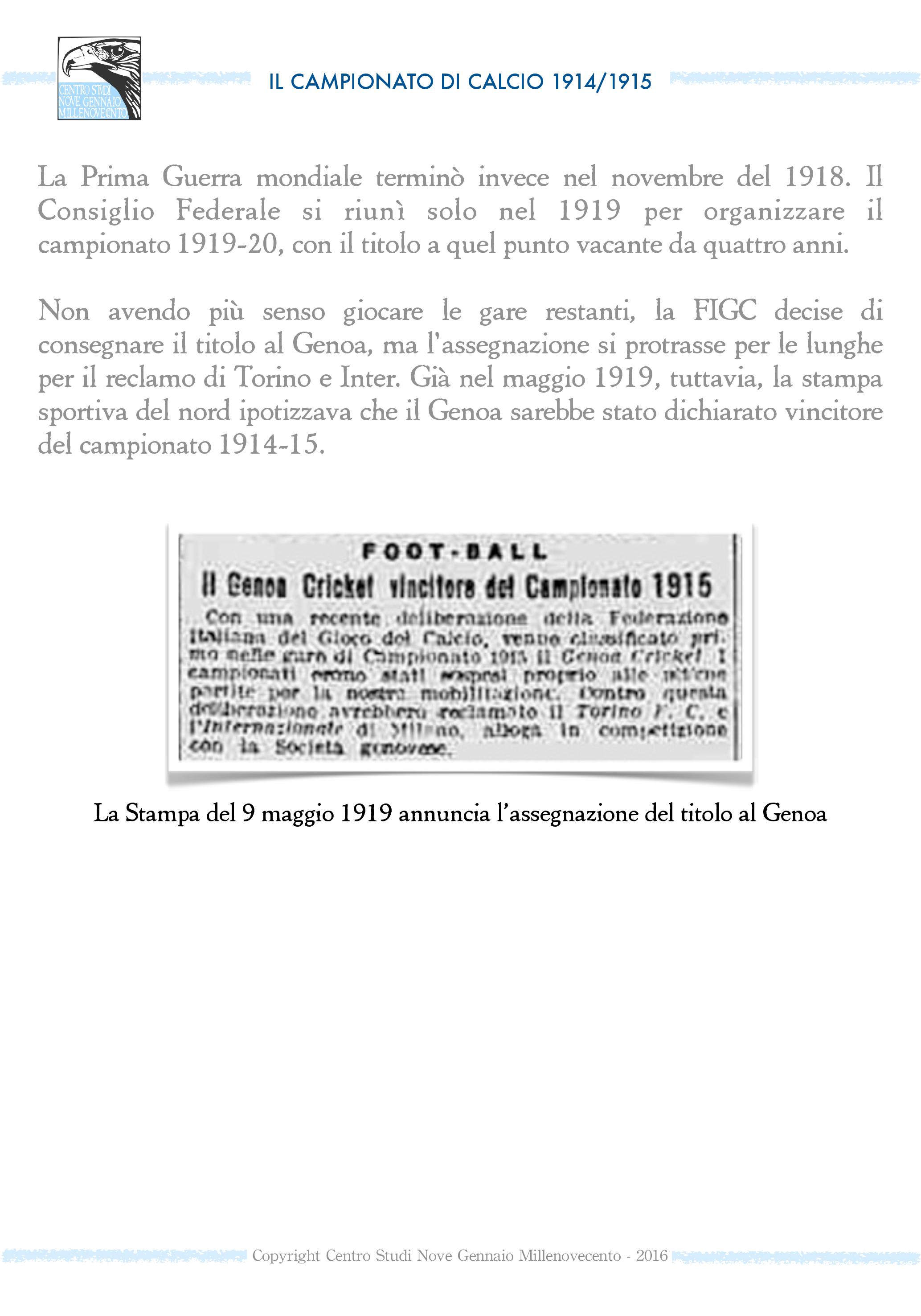 Ci furono calciatori rossoblù che non seppero mai di aver vinto il campionato perché nel frattempo erano morti in guerra. In ogni caso, per non ledere i diritti acquisiti dal Genoa un secolo fa, l’unica via sarebbe quella di dare a due squadre, la Lazio e il Genoa, lo scudetto 1914-15.