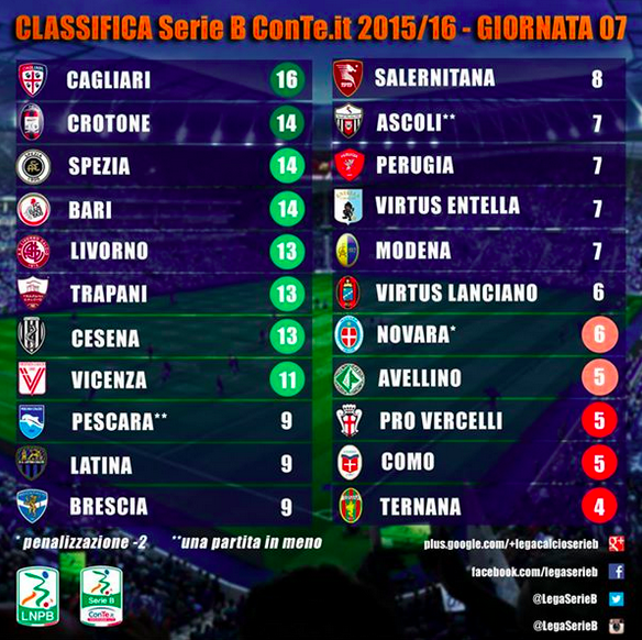 Il terzetto formato da F.C. Crotone, Spezia Calcio e FC Bari 1908 insegue il Cagliari Calcio capolista, mentre la Ternana Calcio S.p.a. ritorna all’ultimo posto.