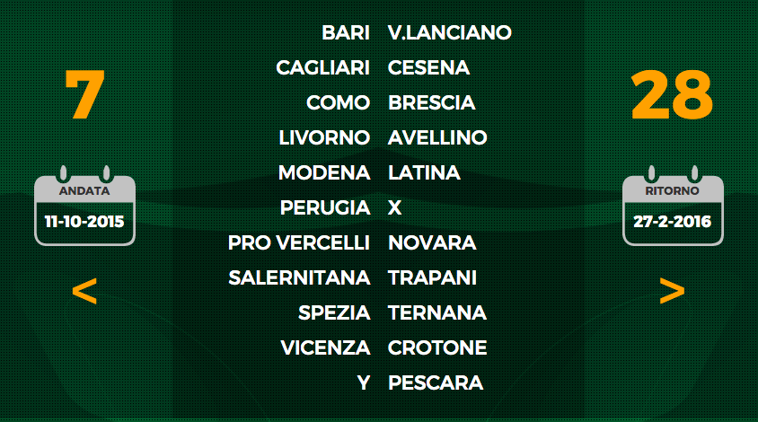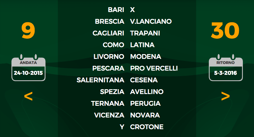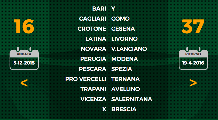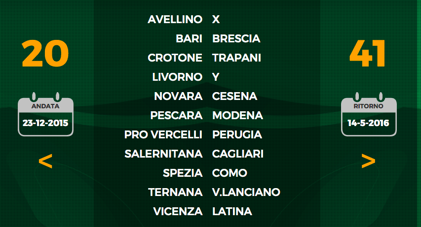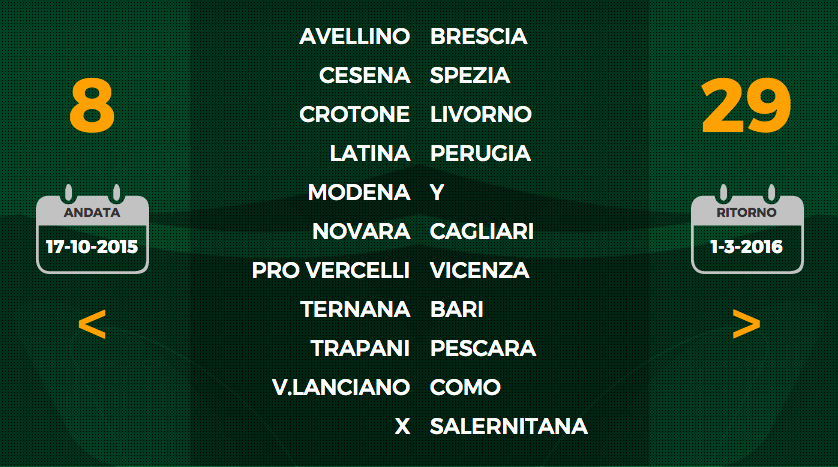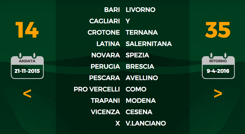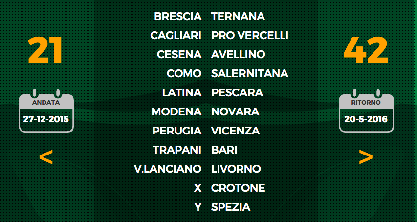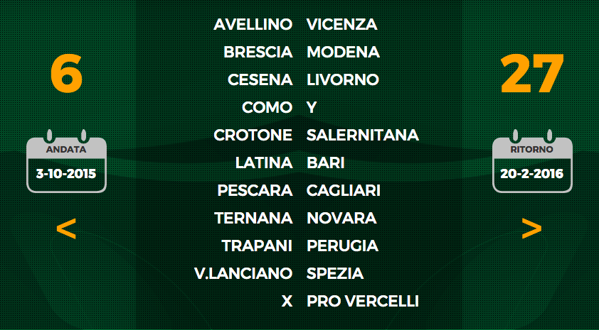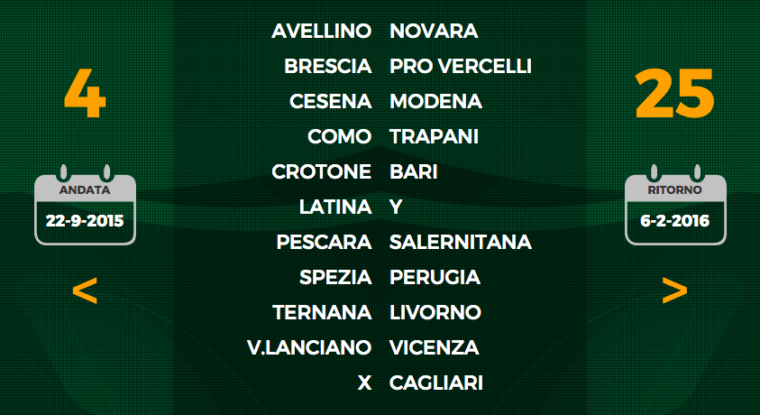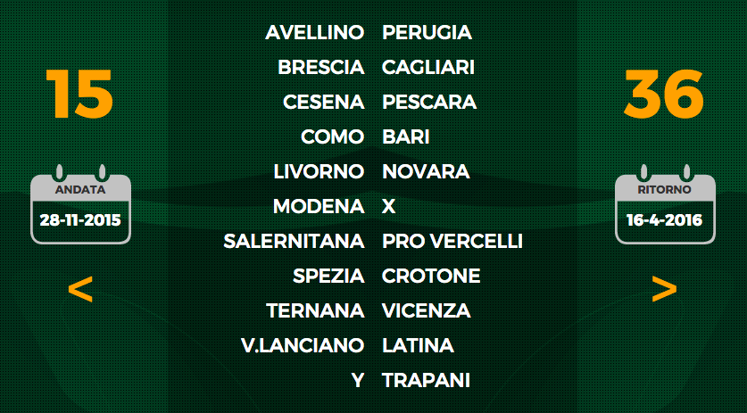 Altra novità riguarda la finalissima play-off promozione con tempi supplementari ed eventuali rigori solo però se le due squadre arrivano a pari punti nella stagione regolare e con la stessa differenza reti nei due scontri diretti dei play-off. Di seguito il calendario tutte le 42 giornate del campionato italiano di calcio di Serie B 2015-2016.