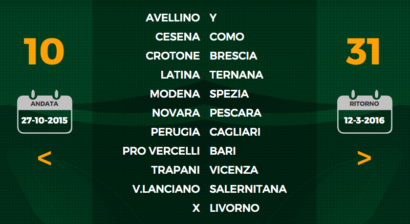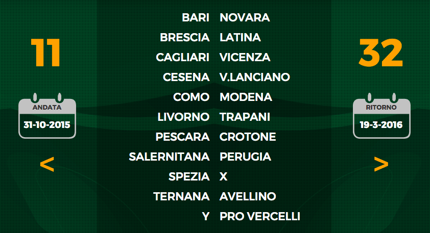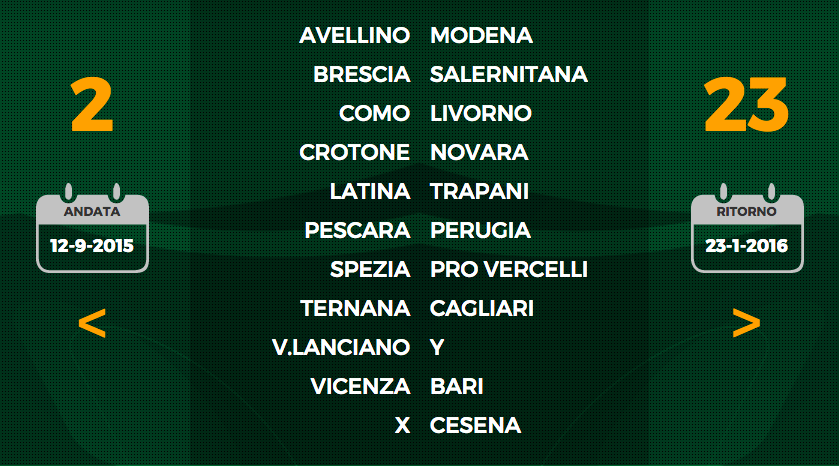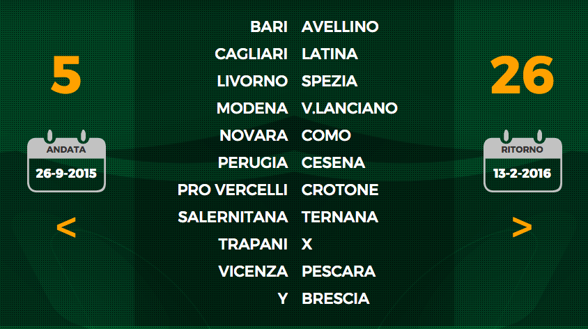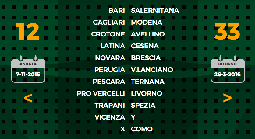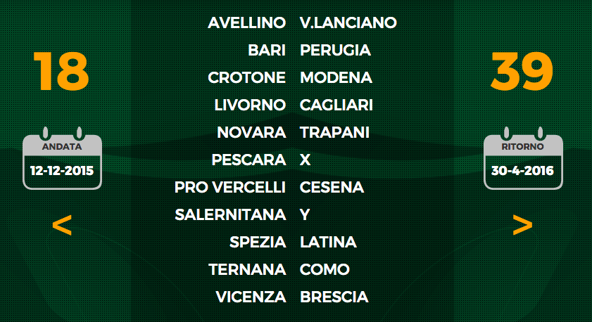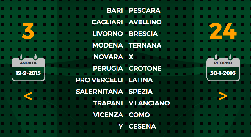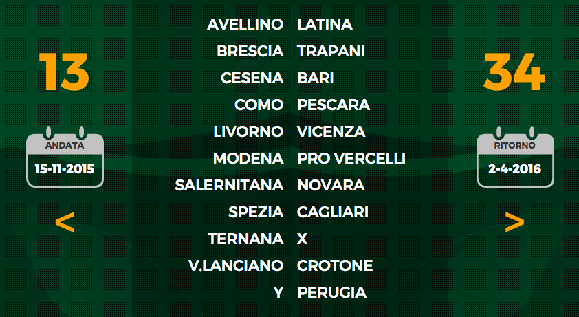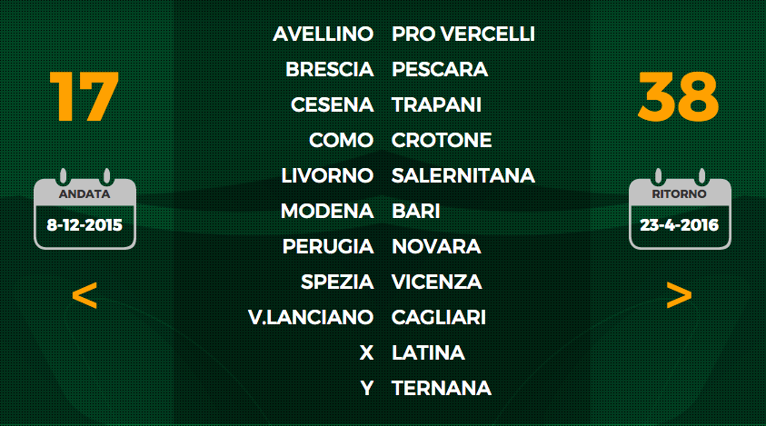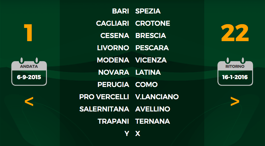 Altra novità riguarda la finalissima play-off promozione con tempi supplementari ed eventuali rigori solo però se le due squadre arrivano a pari punti nella stagione regolare e con la stessa differenza reti nei due scontri diretti dei play-off. Di seguito il calendario tutte le 42 giornate del campionato italiano di calcio di Serie B 2015-2016.