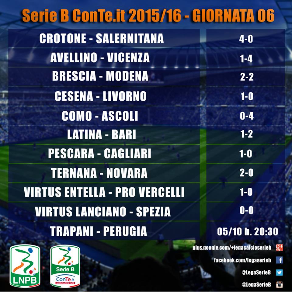 Il Cagliari Calcio cade contro il Pescara Calcio e subisce la prima sconfitta stagionale, mentre Roberto Breda festeggia l’esordio sulla panchina del Ternana Calcio S.p.a. sconfiggendo 2-0 il Novara Calcio 1908 e regalando così agli umbri i primi tre. Il Bari ha vinto per 2-1, in rimonta, sul difficile campo del Latina di Mark Iuliano.