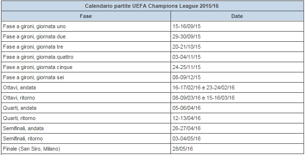 La prima fase della Champions League inizierà a partire da martedì 15 e mercoledì 16 settembre, con l’avvio del primo turno. La fase a gironi si concluderà tra l’8 e il 9 dicembre, quando verrà giocata la sesta giornata.
