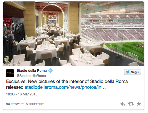 ROMA – Il progetto del nuovo stadio della Roma “sta procedendo benissimo, siamo entusiasti”. James Pallotta guarda avanti e, nonostante il ritardo nella presentazione del dossier definitivo in Comune (da girare poi alla Regione per la conferenza dei servizi, dove ci sono fino a 180 giorni per la decisione finale) e gli esposti di residenti e Cinquestelle in Procura, continua a pubblicizzare il futuro impianto giallorosso che sorgerà nella zona di Tor di Valle. Ecco quindi che attraverso i social network sono state rilasciate immagini inedite degli interni del nuovo stadio che in futuro prenderà il posto dell’Olimpico. Le foto diffuse su internet mostrano un’anteprima di zona ristorazione e sky box.