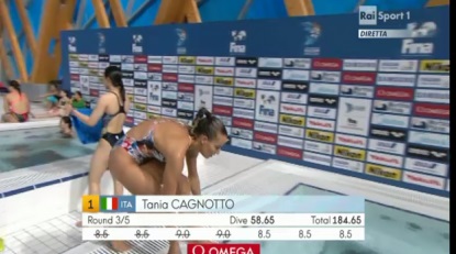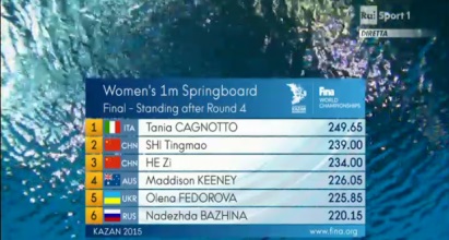 L’Italia torna sul gradino più alto del podio in una mondiale 40 anni dopo l’oro di Klaus Dibiasi nel 1975 quando vinse il titolo nella piattaforma 10 metri ai mondiali di Cali, in Colombia. Nella gara di Kazan, Tania Cagnotto ha preceduto le cinesi Shi Tingmao di 1,75 punti e He Zi di 10,55 punti.