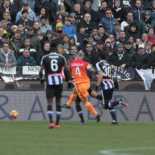 Nel giro di 20′ i giallorossi collezionano almeno tre occasioni, segnano un gol e falliscono un rigore. E i bianconeri sembrano in evidente difficoltà ; il centrocampo friulano fatica a filtrare e la difesa soffre. Lo si intuisce già al 2′ quando Strootman serve in profondità Dzeko che, a tu per tu con Karnezis, sbaglia la misura del pallonetto a scavalcare il portiere friulano e calcia alto.