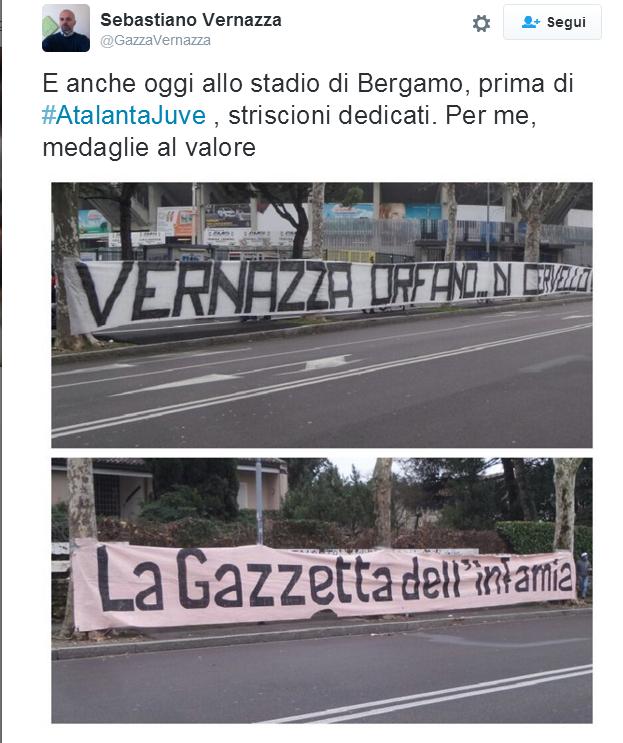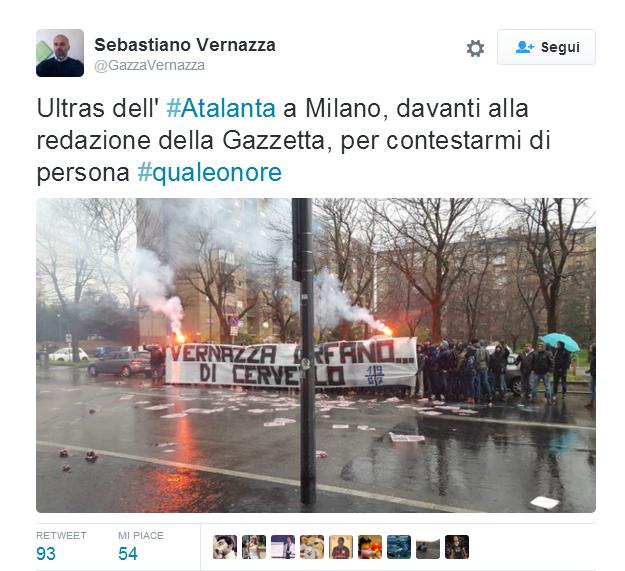 Per questo la mattina di domenica 6 una settantina di ultras dell’Atalanta sono andati a contestare Vernazza e la Gazzetta sotto la sede del giornale sportivo a Milano. Gli atalantini hanno acceso fumogeni e hanno esposto uno striscione “Vernazza orfano… di cervello”, chiedendo di poter parlare con Vernazza e con il direttore della Gazzetta per un confronto. Gli uomini della sicurezza della Gazzetta hanno risposto loro che non erano presenti né Vernazza né il direttore. Nello striscione gli ultras dell’Atalanta facevano riferimento all’articolo di Vernazza dal titolo “Se i bambini omaggiano il capo ultrà”: