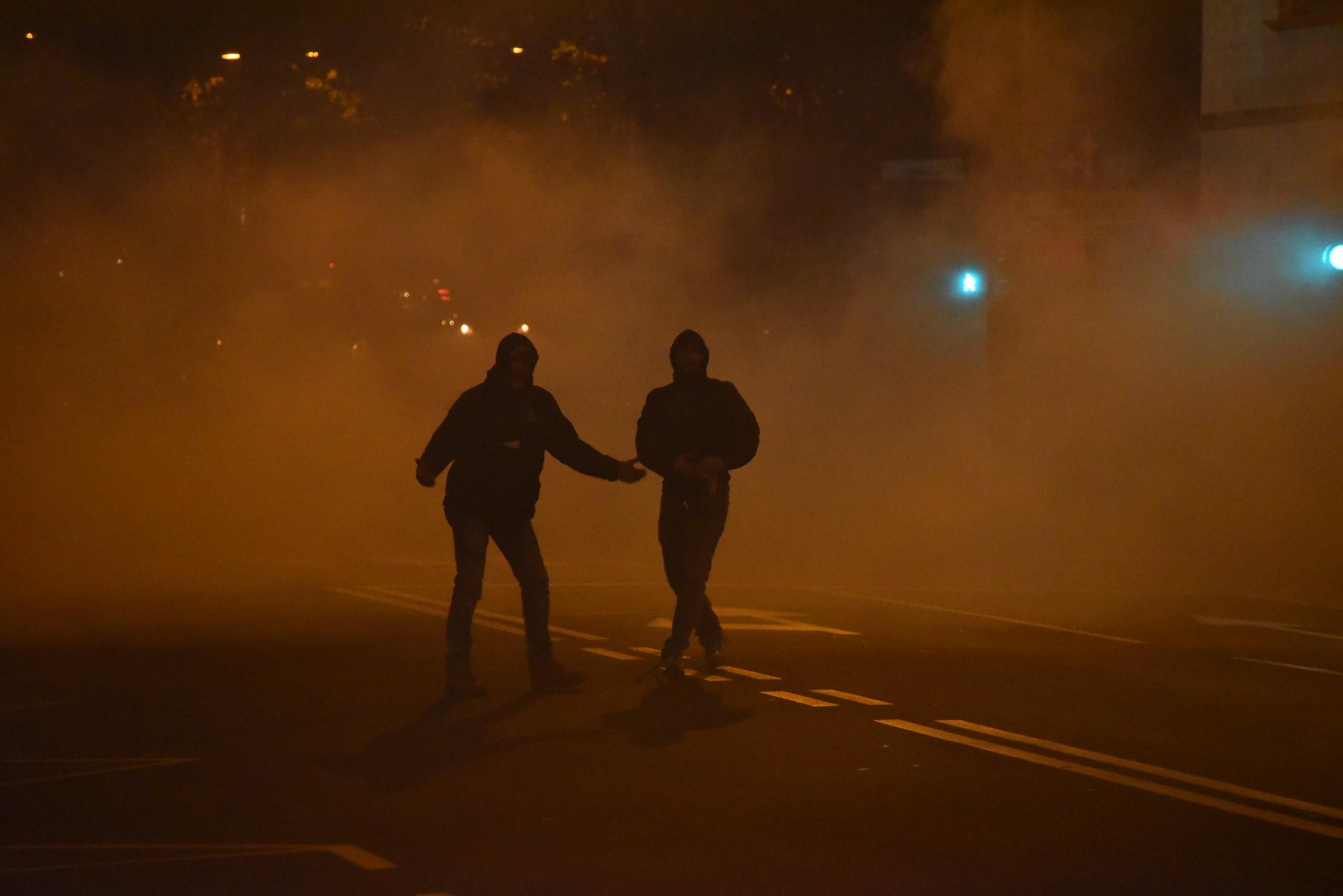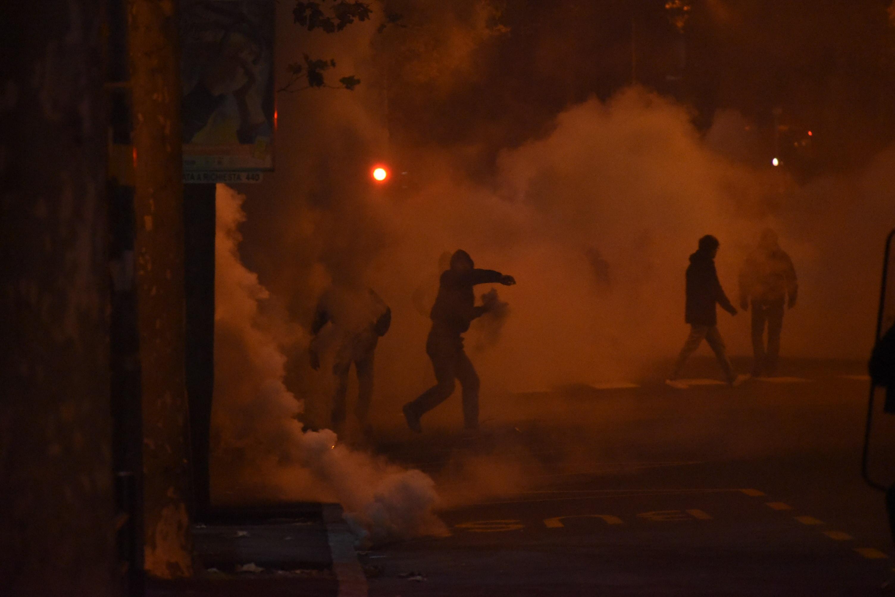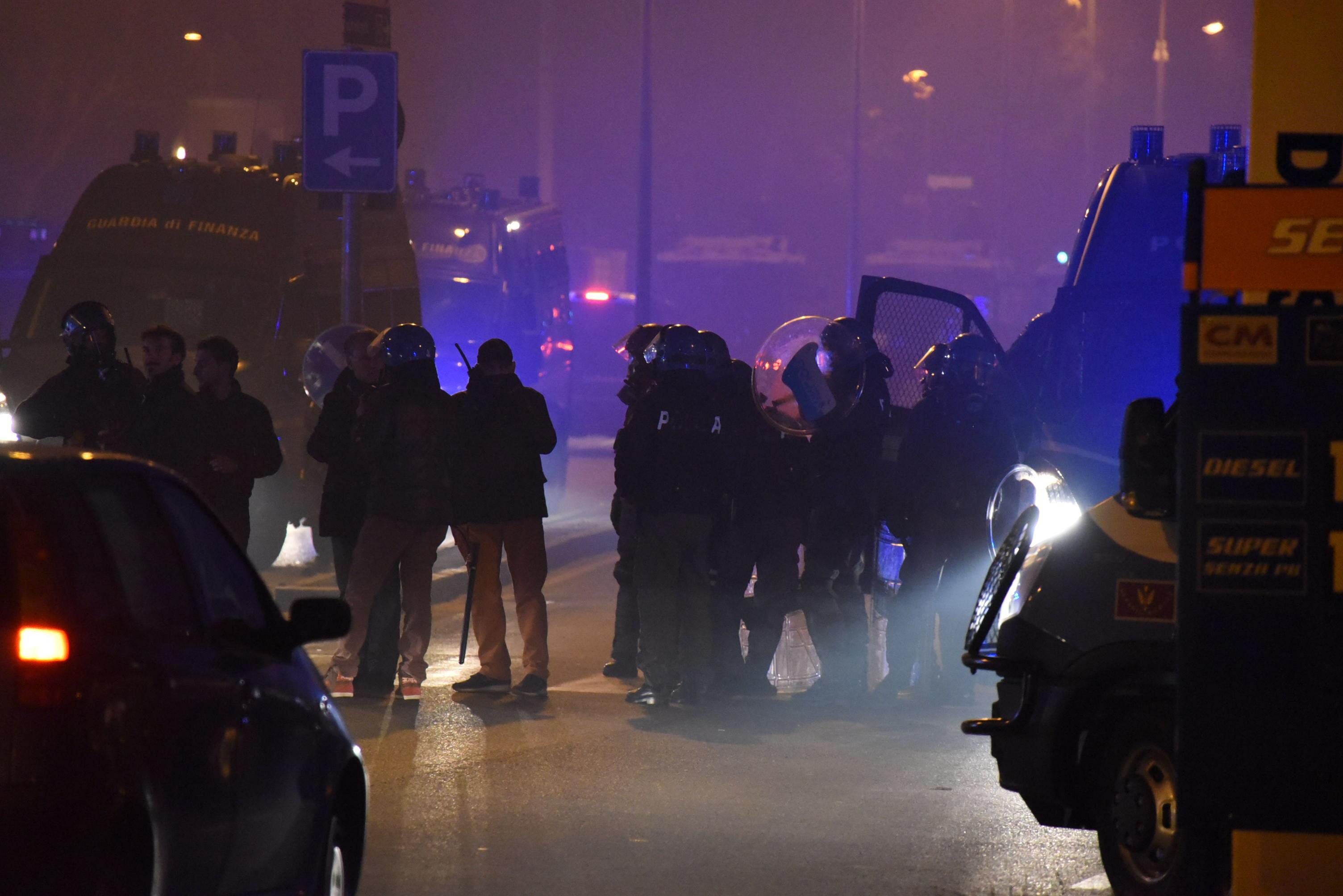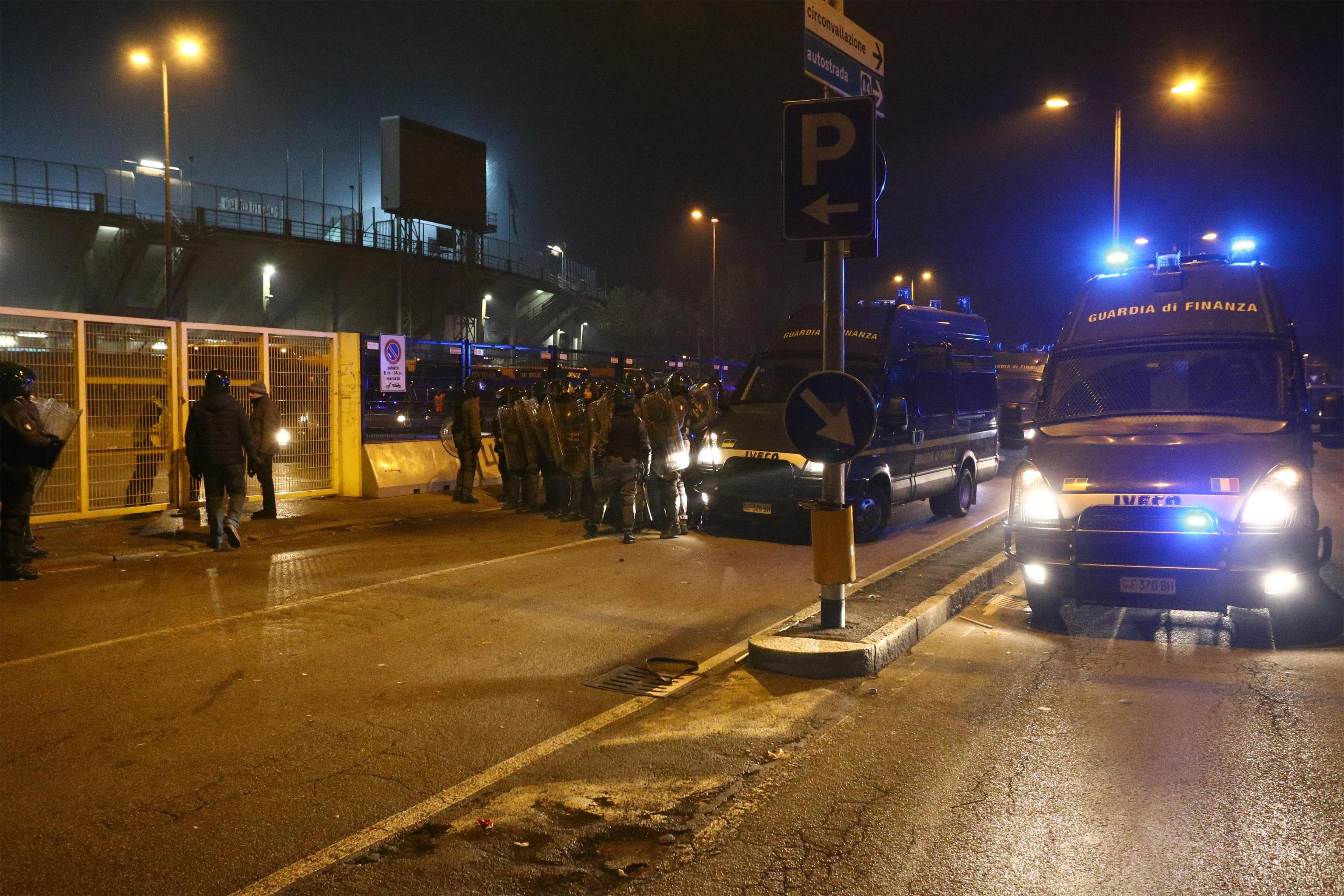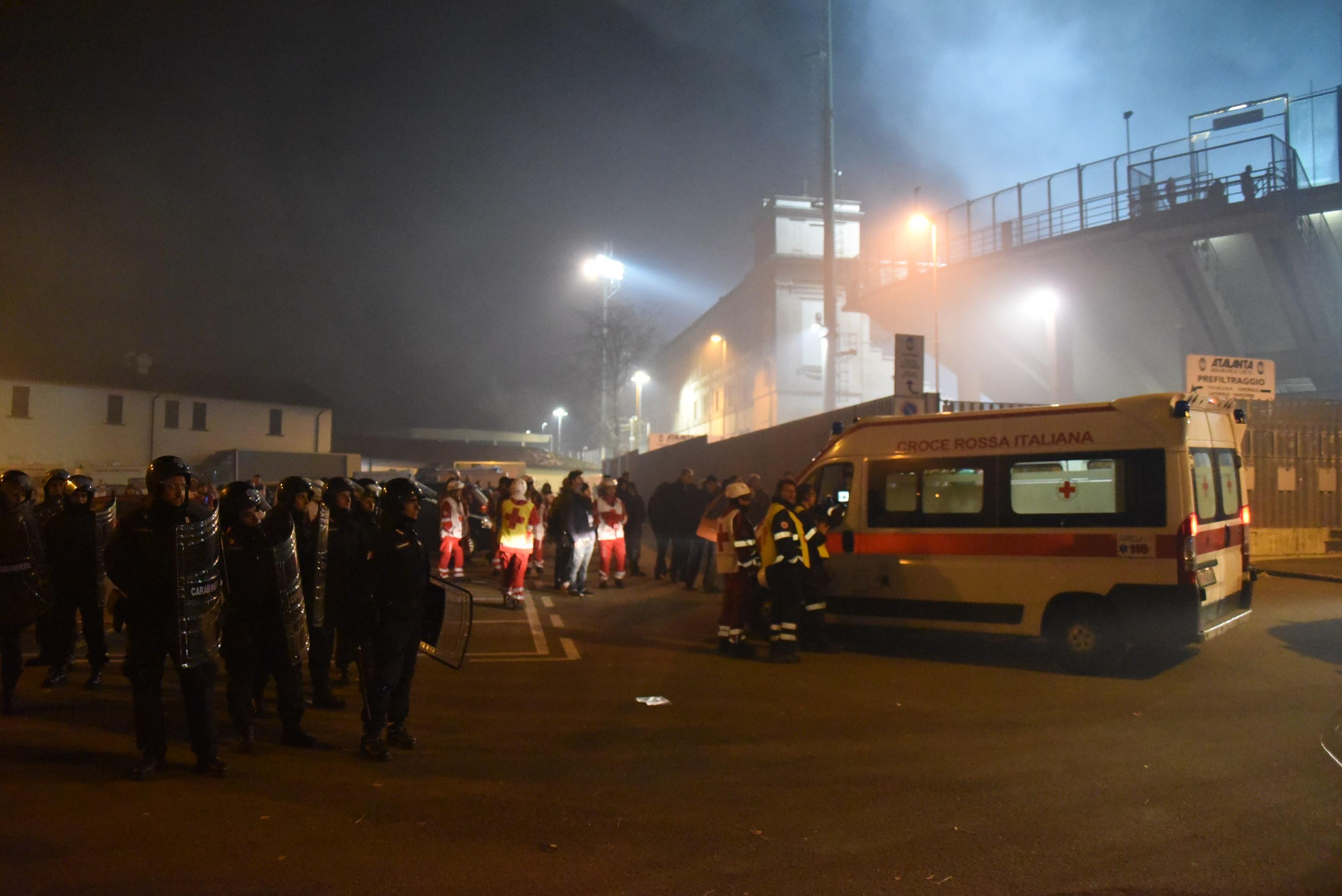 Tifosi atalantini durante gli scontri con le forze dell’ordine all’esterno dello stadio Atleti Azzurri d’Italia di Bergamo (Ansa)