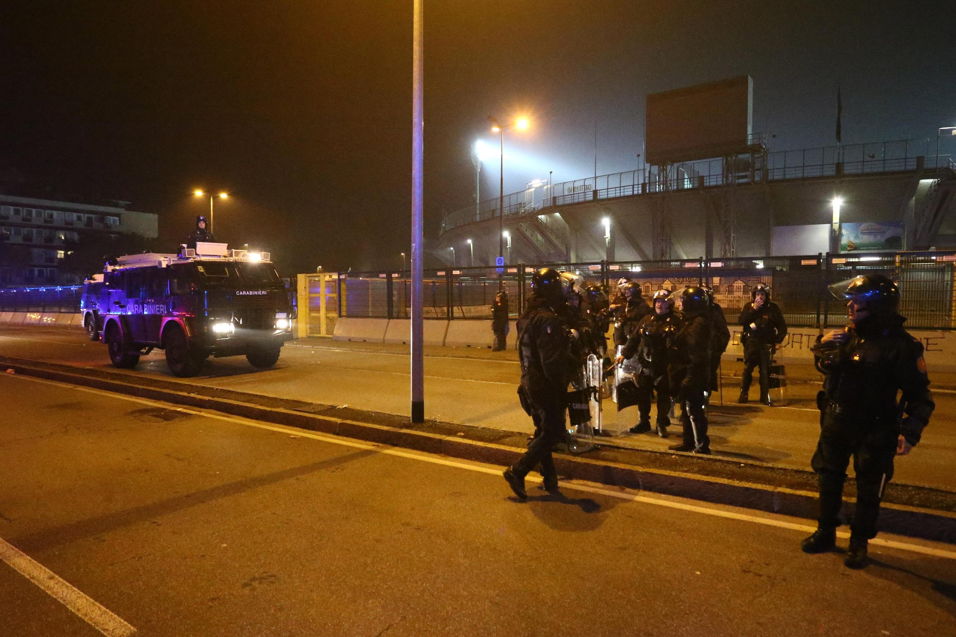 Polizia e carabinieri schierati fuori dallo stadio Atleti Azzurri d’Italia di Bergamo (Ansa)