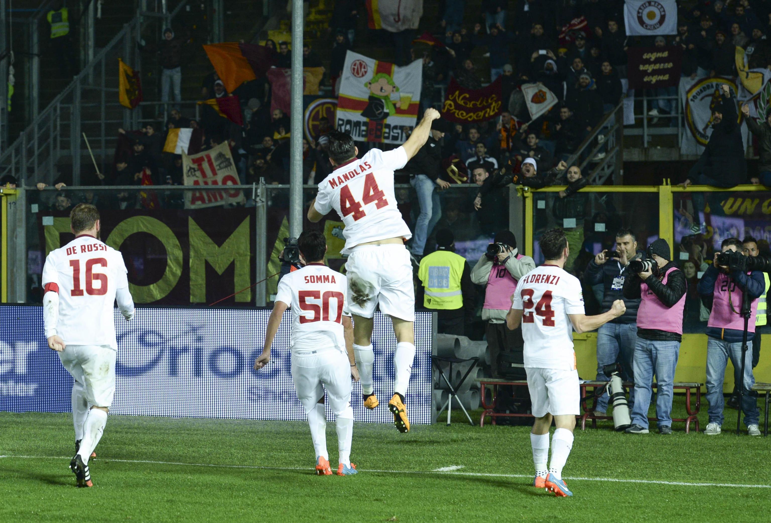 I giallorossi festeggiano sotto la curva a fine partita (Ansa)