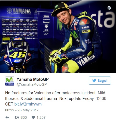 La stessa scuderia Yamaha, sul suo account Twitter, ha pubblicato una nota sulle condizioni di Rossi, parlando di un “lieve trauma toracico e addominale”, spiegando che “non sono state riscontrate fratture in nessuna parte del corpo e non sono state rilevate serie patologie di carattere traumatico”.