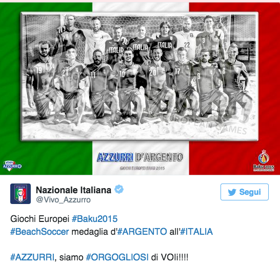 BAKU, AZERBAIGIAN – L’Italia ha conquistato la medaglia d’argento nel beach soccer ai Giochi Europei di Baku. In finale gli azzurri sono stati sconfitti per 3-2 dalla Russia, che ha vinto quindi la medaglia d’oro.
