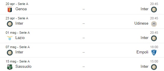 INTER (61) – Le possibilità di entrare in Champions, concrete ma non elevatissime, passano necessariamente da un filotto di cinque vittorie. Le avversarie si chiamano Genoa a Marassi, Udinese, Lazio all’Olimpico, Empoli e Sassuolo in trasferta all’ultima. Il vantaggio dei nerazzurri è nello scontro diretto con la Roma.