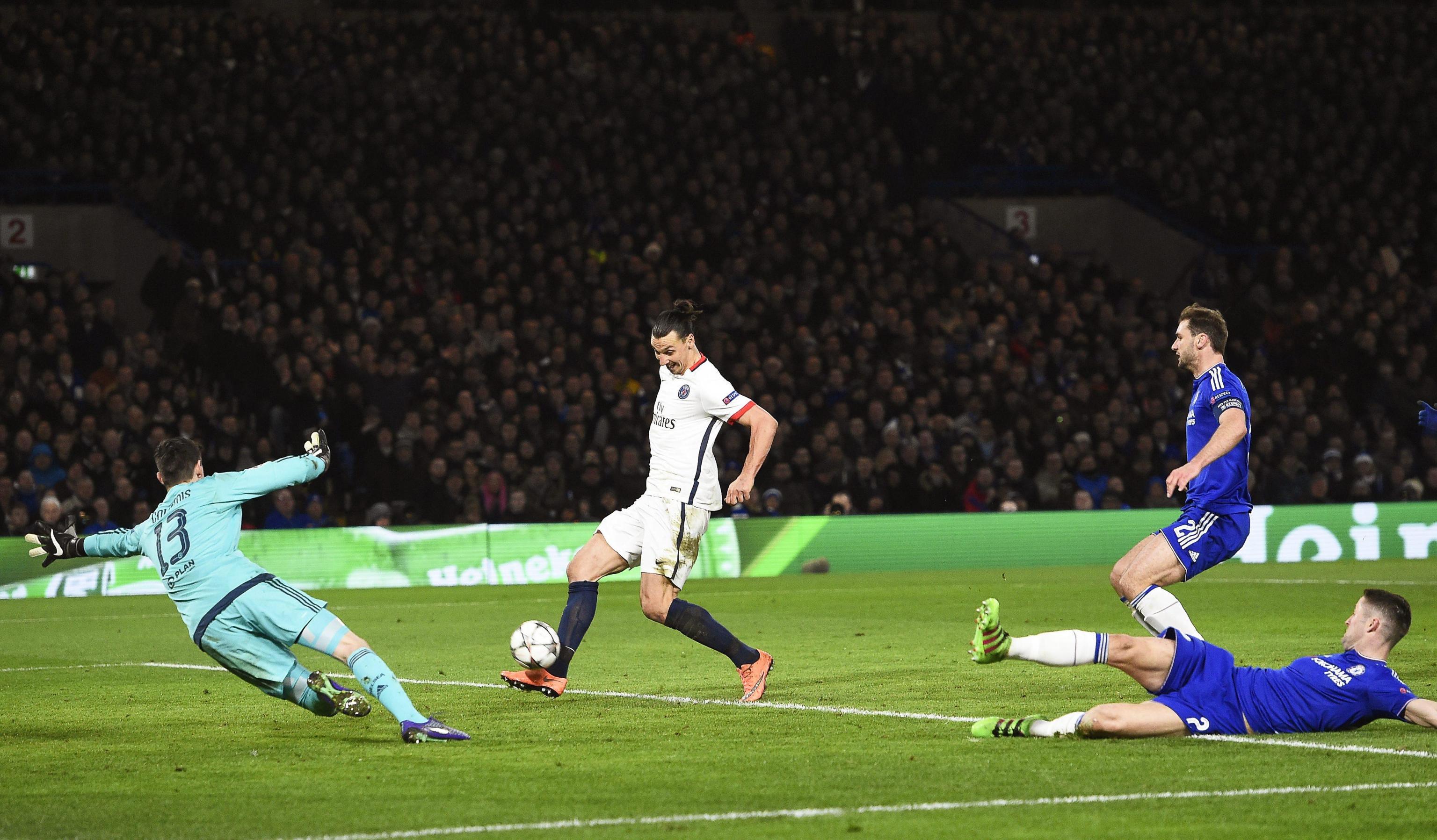 Zlatan Ibrahimovic segna il 2-1 superando Thibaut Courtois EPA/FACUNDO ARRIZABALAGA