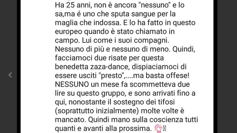 Che la Biasi non fosse una semplice e silenziosa nuova “wag” azzurra si era capito dalla sua intraprendenza sui social network. Ed ora dimostra tutto il suo carattere anche in questa occasione: “Sei un ignorante – replica a muso duro a chi offende Zaza – il giorno nel quale avrai 1/10 delle p…, della riservatezza e dell’umiltà di Simone, forse potrai definirti uomo”.