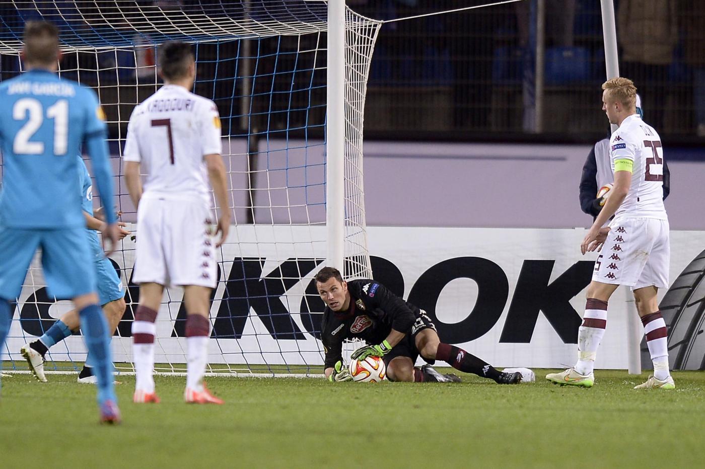 Torino (3-5-2): Padelli 6, Maksimovic 5, Glik 5.5, Moretti 6, Darmian 5, Benassi 4.5, Gazzi 6, El Kaddouri 5, Molinaro 5.5, Martinez 5 (34′ pt Vives sv, 6′ st Farnerud 5), Quagliarella 5.5 (28′ st Maxi Lopez 6). (13 Castellazzi, 21 Silva, 5 Bovo, 22 Amauri). All.: Ventura 6. Arbitro: De Sousa (Portogallo) 6.5. Reti: nel pt 38′ Witsel; nel st 8′ Criscito. Angoli: 5-1 per lo Zenit. Recupero: 1′ e 3′, Espulsi: Benassi 27′ pt per doppia ammonizione. Ammoniti: Javi Garcia e Smolnikov per gioco scorretto, Glik, Molinaro e Ryazantsev per comportamento non regolamentare.